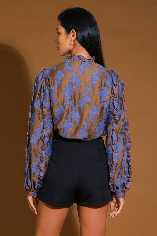 BLUE AND BROWN SATIN JACQUARD LONG SLEEVE TOP
