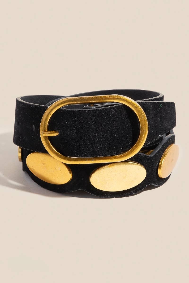 A bold and daring choice that is sure to impress, this belt flaunts a luxurious metallic oval accent faux suede design. A chic and sophisticated belt that's perfect for dressing up or down. Available in GBK, GBR, SBK, SIV. This item is sold in packs of 1.
