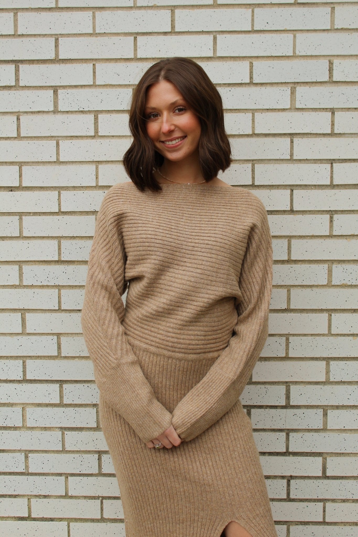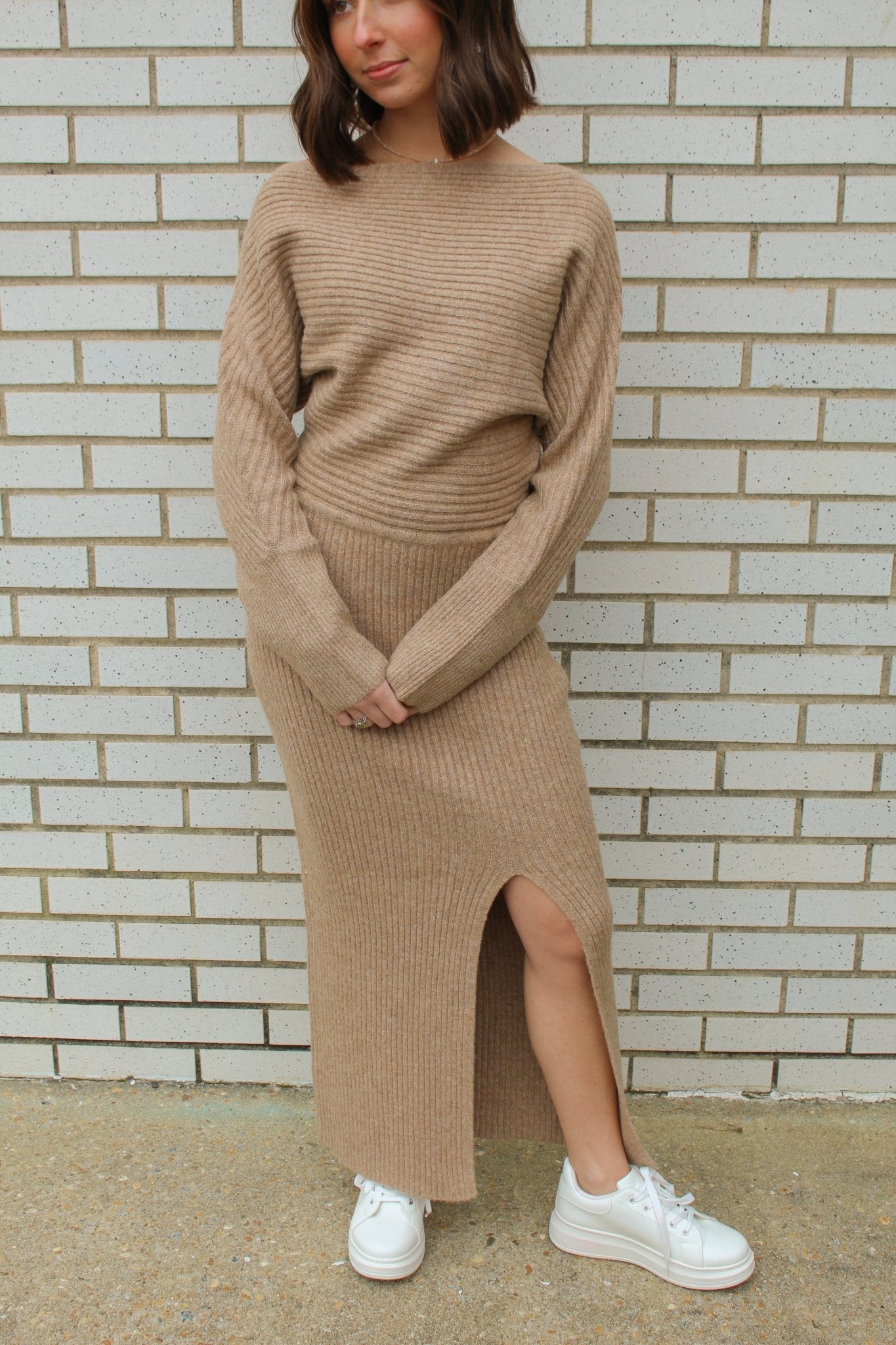 LATTE ONE SHOULDER OFF SIDE SLIT MIDI KNIT SWEATER DRESS