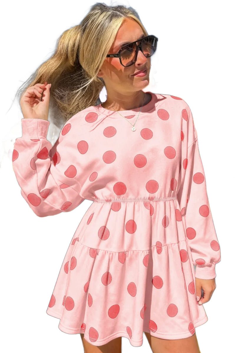 Two-tone pink polka dots meet cozy comfort in this laid-back set. The drop-shoulder pullover pairs perfectly with drawstring shorts for effortless style that works whether you're relaxing at home or running errands. Throw on sneakers or slides and you're ready to go.