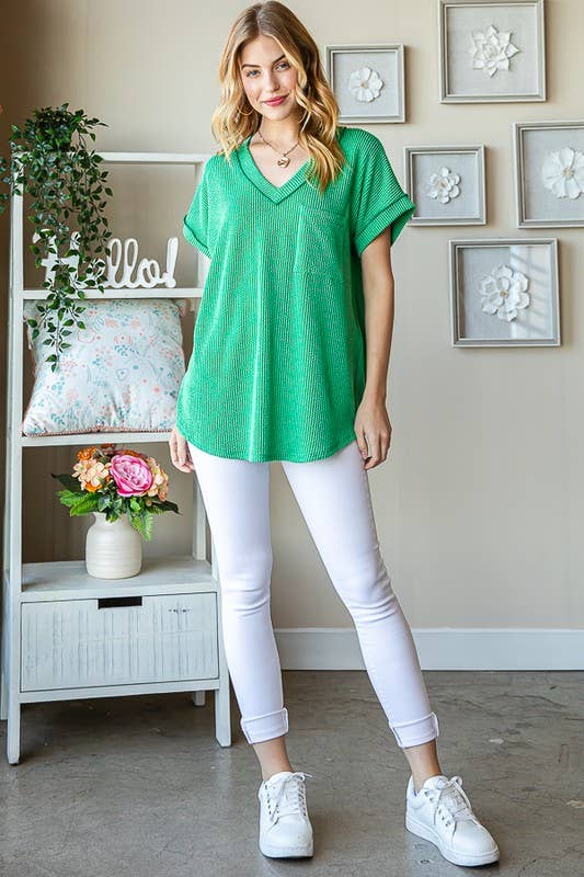 DOLMAN SHORT SLEEVE WITH BAND V NECK WITH BAND SOLID URBAN RIBBED TOP WITH FRONT POCKET AND ROUND HEM DETAIL
