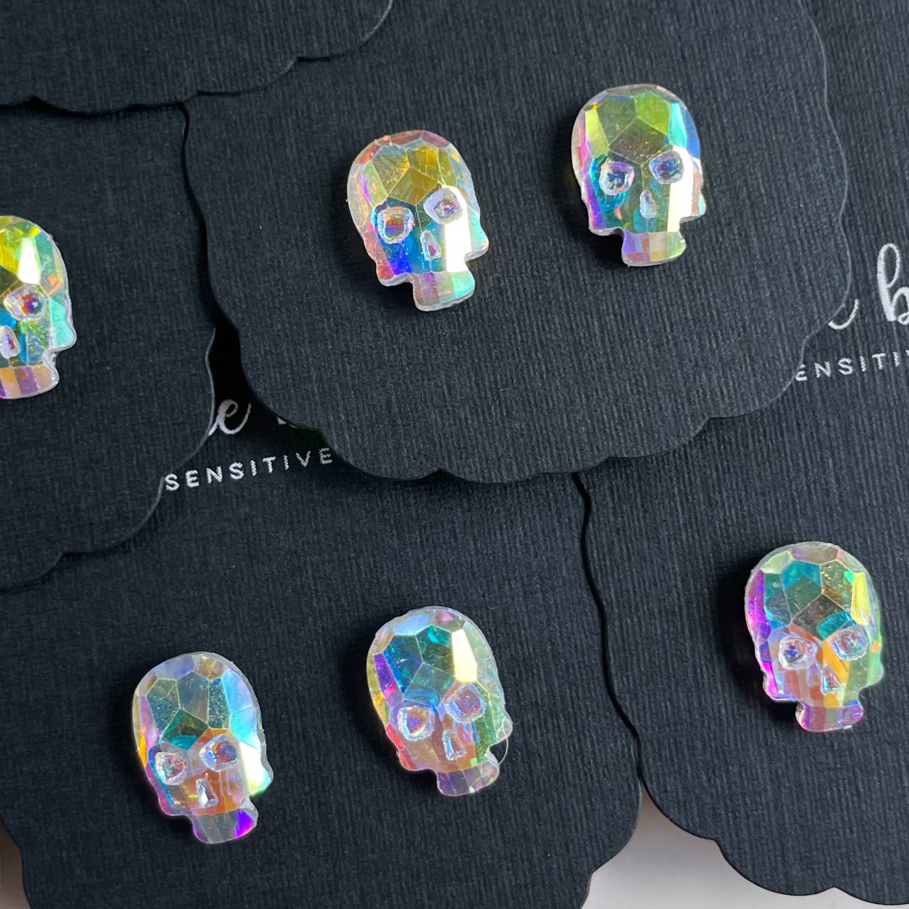 Marauder's Diamond Skulls features: *10x14mm AB Resin Skulls Studs *All on hypoallergenic surgical stainless steel posts *Great for sensitive ears *Made in the USA. Designed to elevate your wardrobe, ideal for polished, modern dressing.
