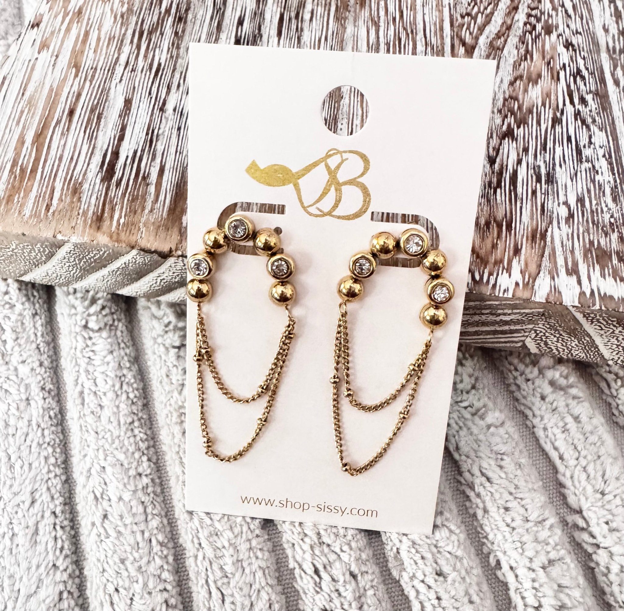 Gold Inlayed CZ and Beaded Chain Drop Earrings