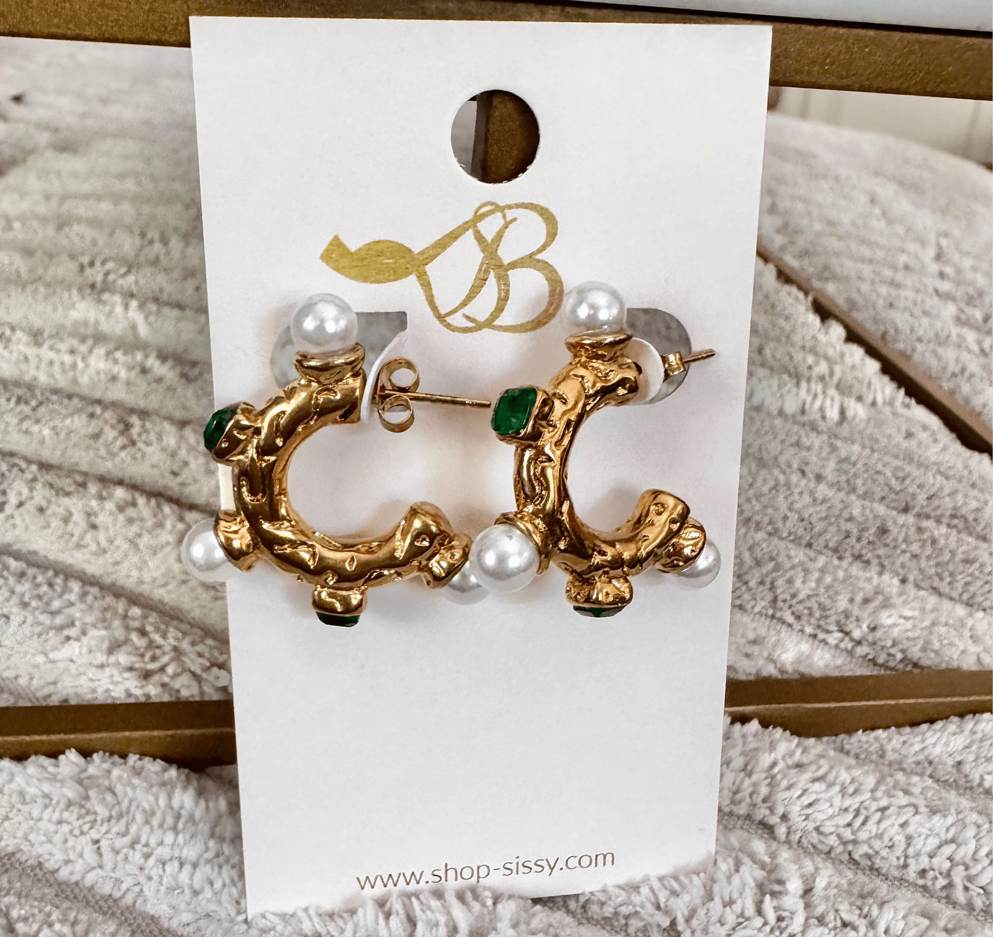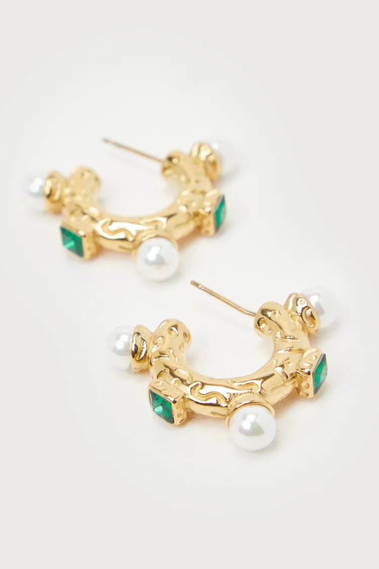 Pearl and Inset Faux Emerald 18K Gold Plated Hoops