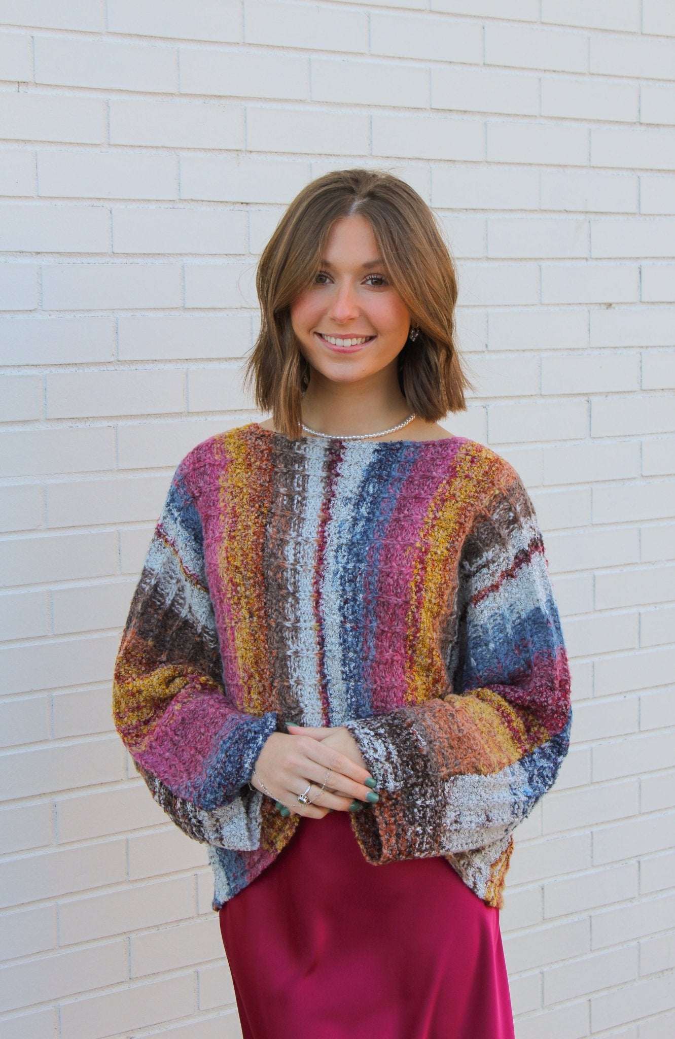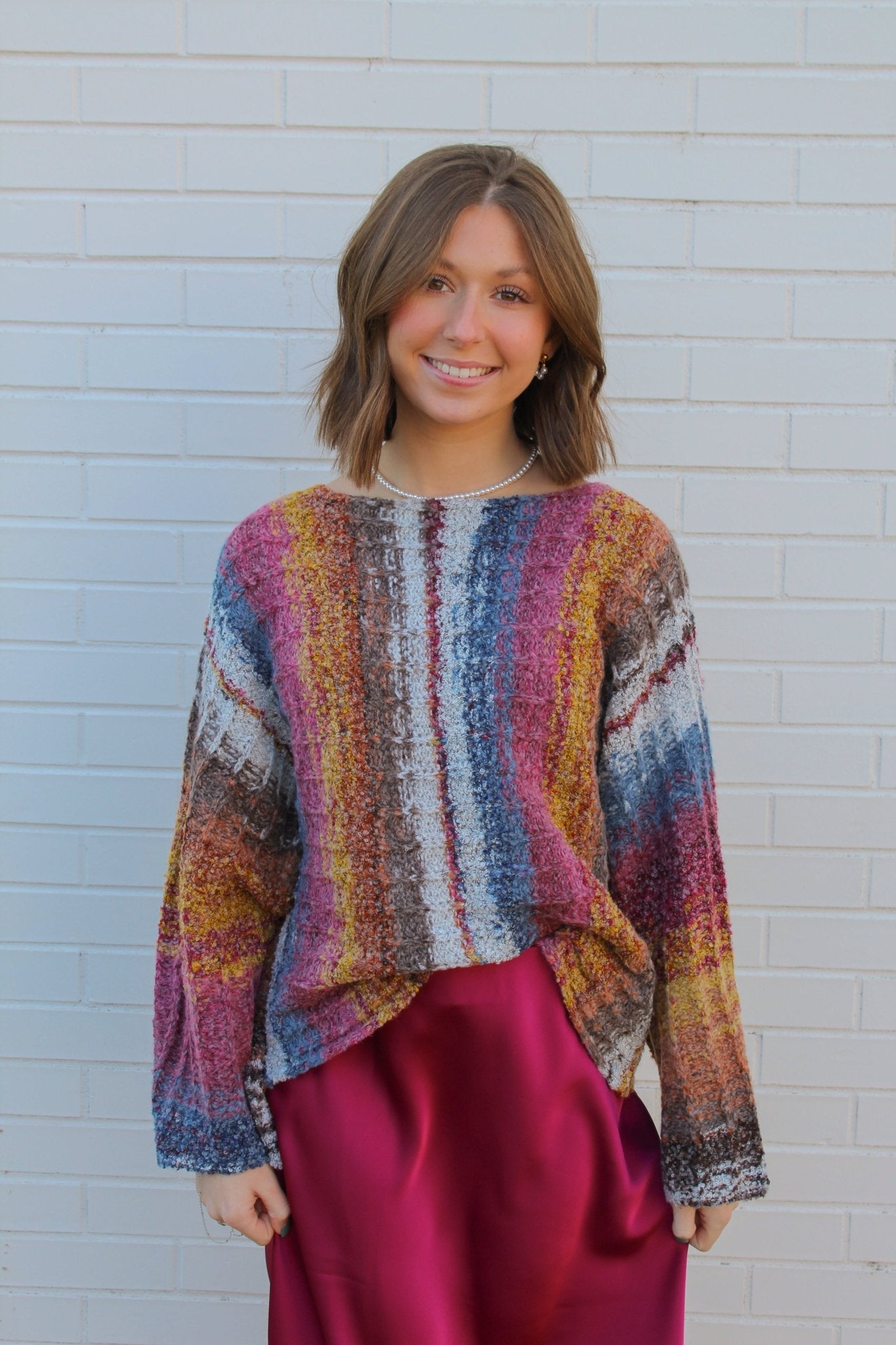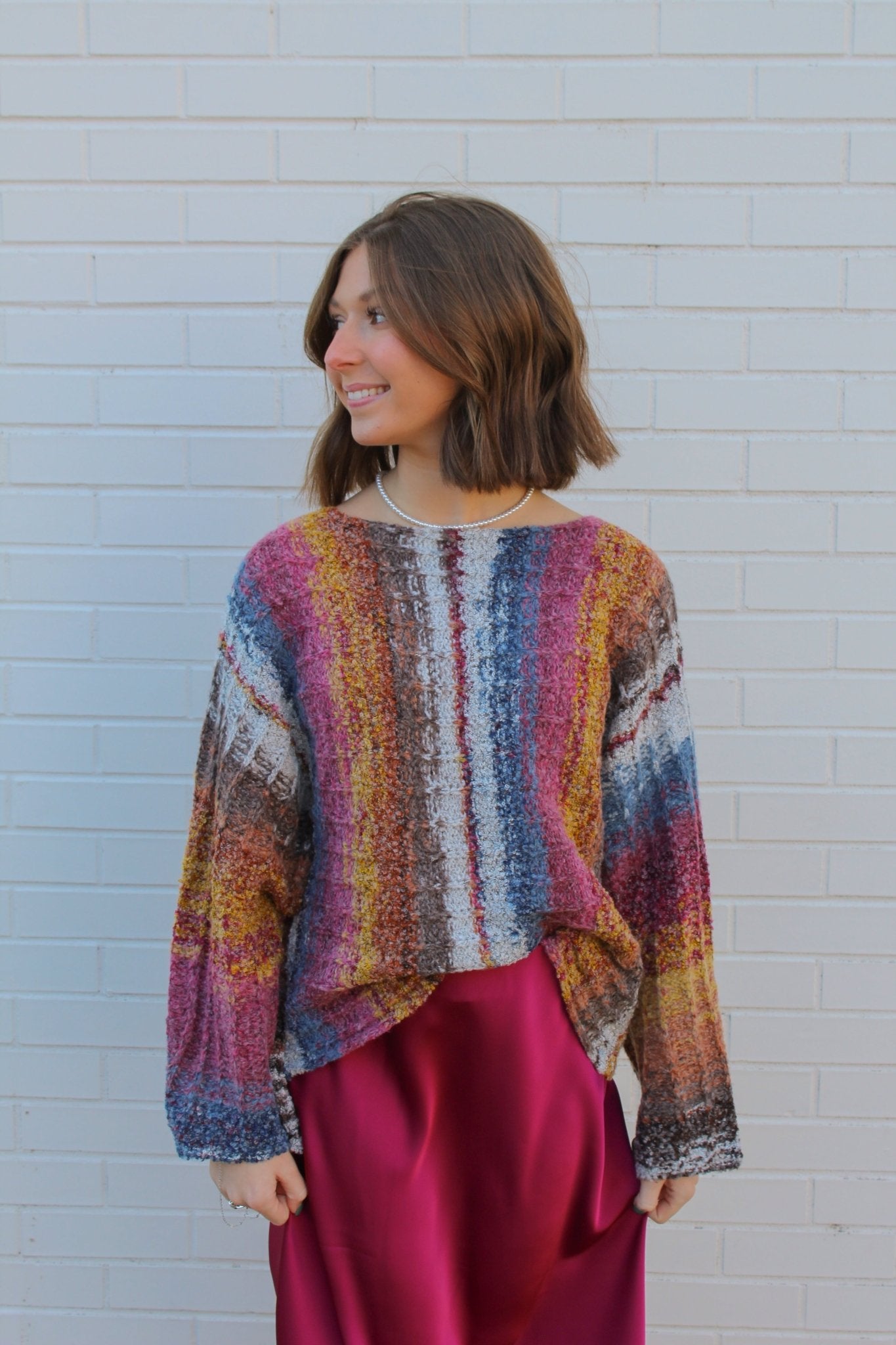 This cozy sweater top combines comfort with style. The boat neckline and wide dolman sleeves create a relaxed, flattering fit that works for everyday wear. Made from a soft blend of acrylic, wool, and polyester, it features a cheerful multi-color stripe pattern in burgundy tones.