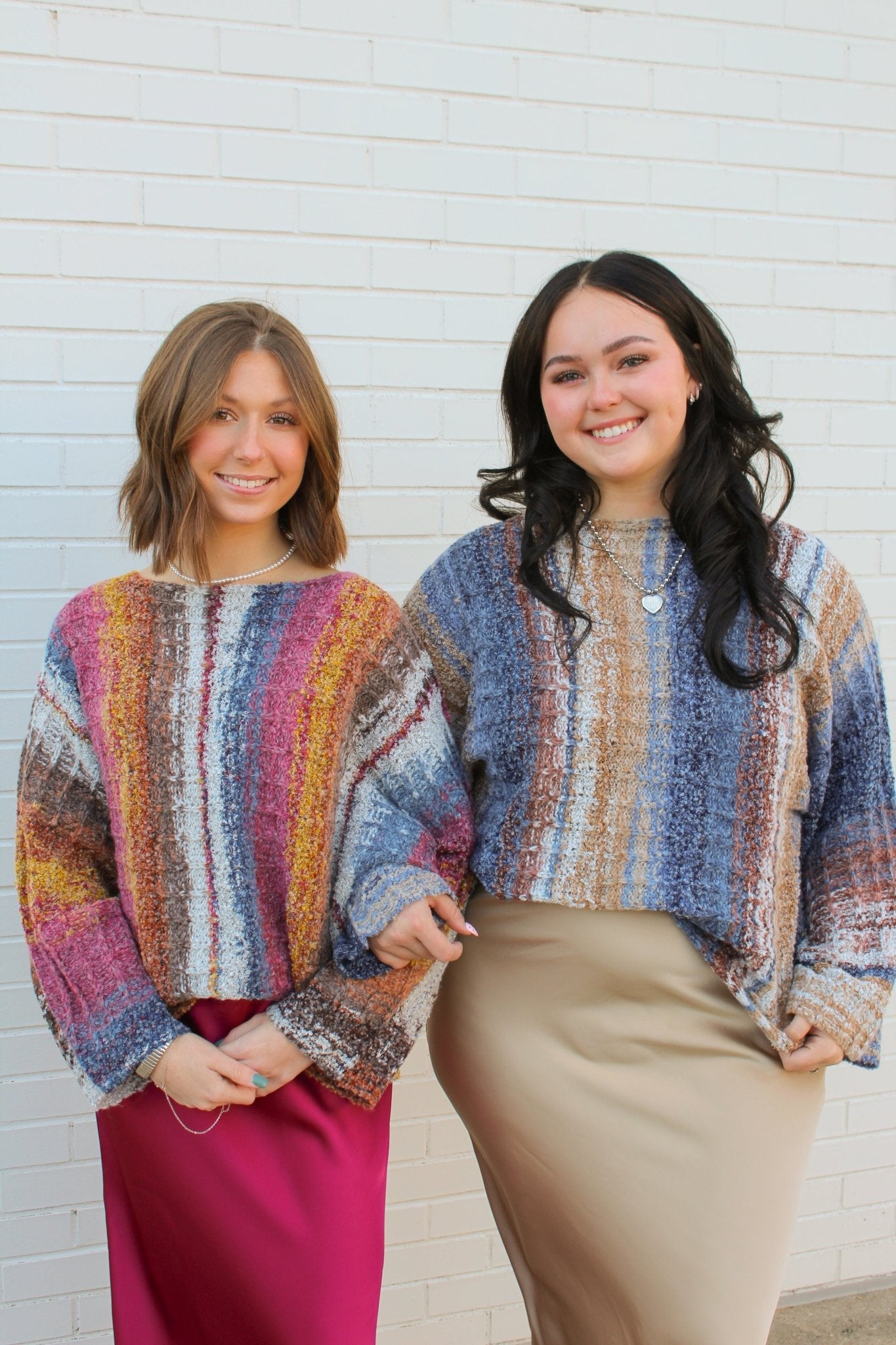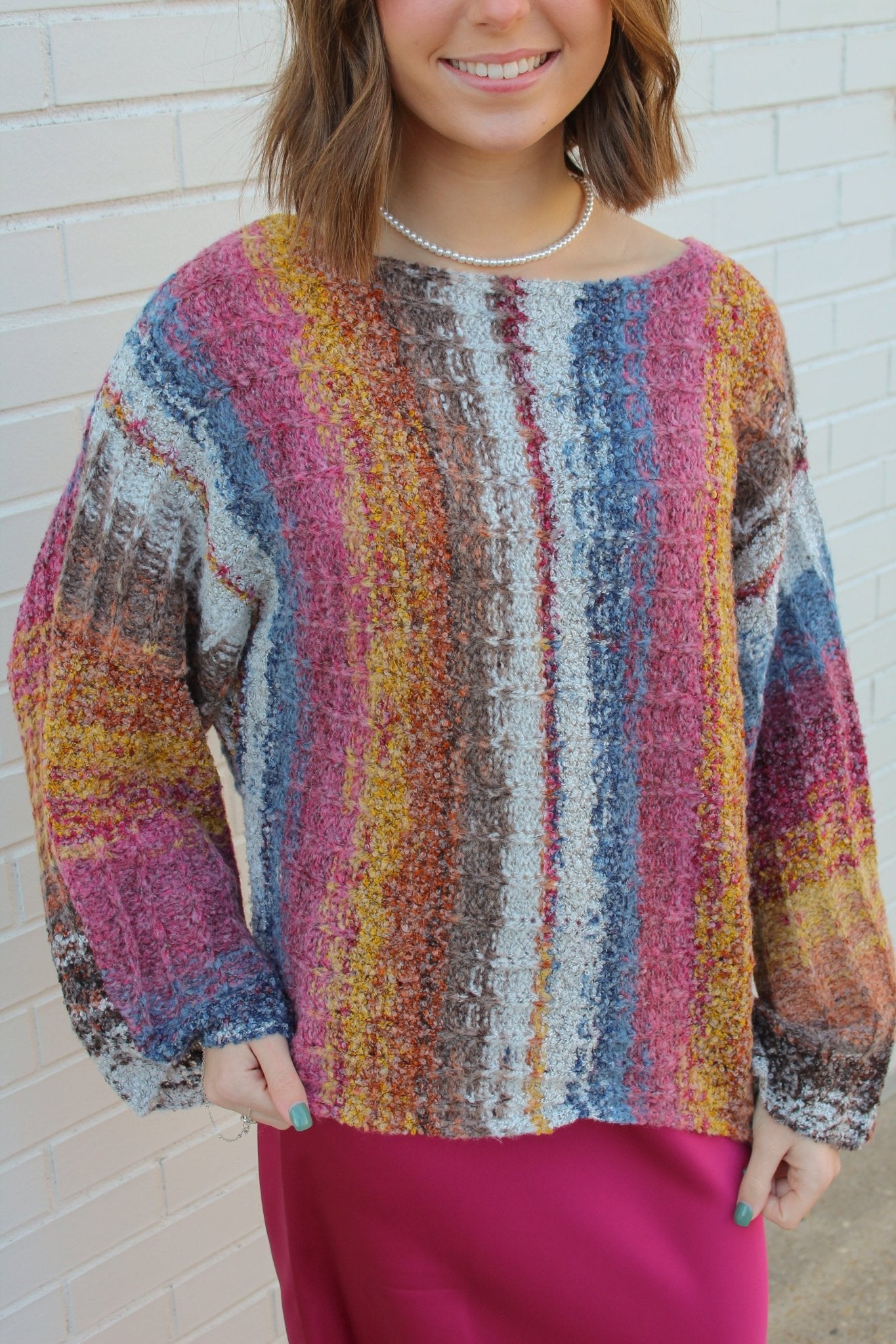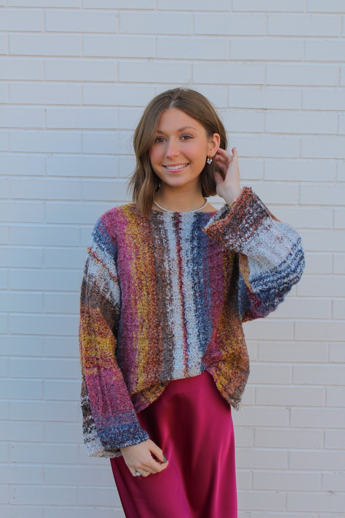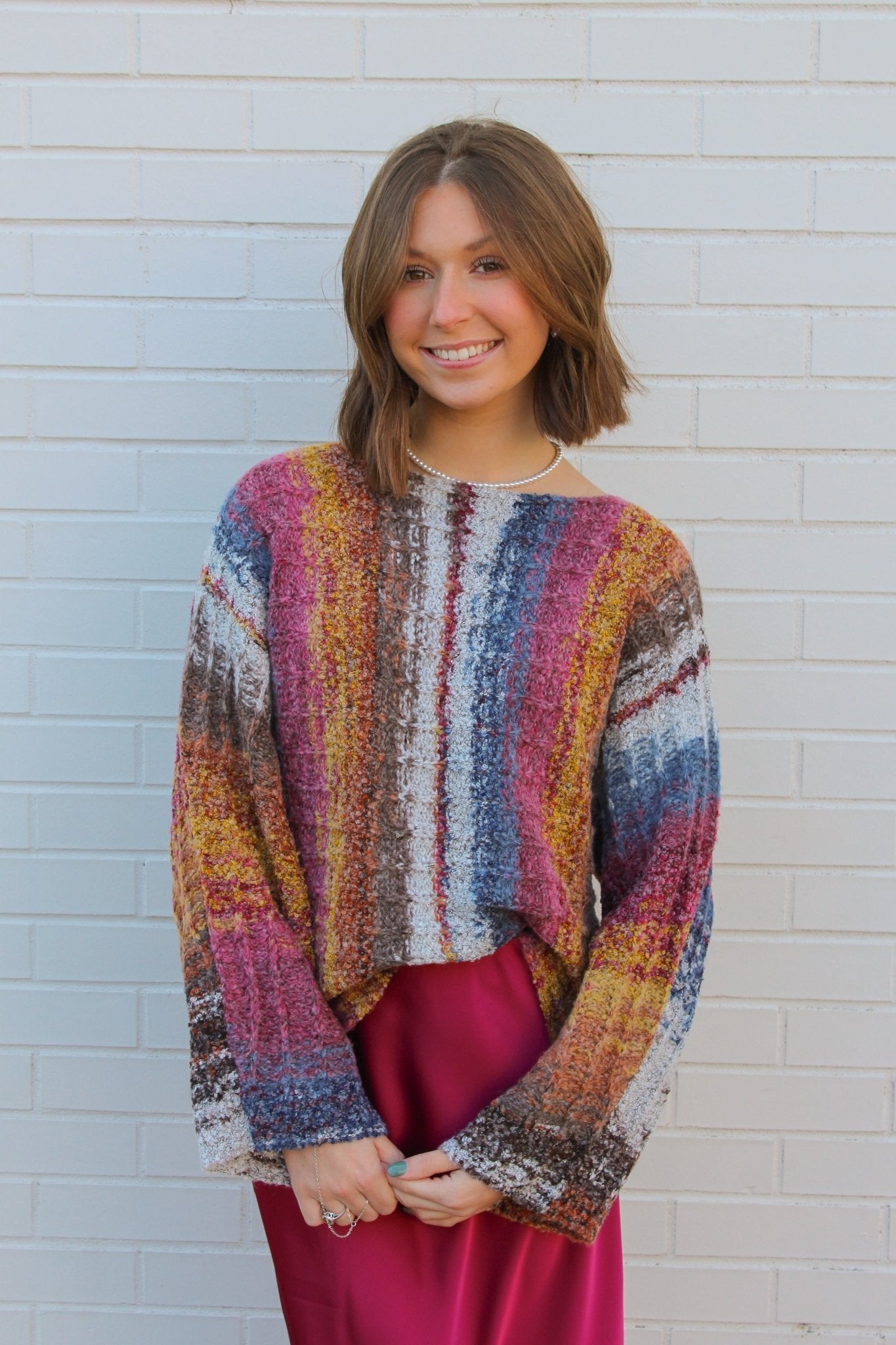 This cozy sweater top combines comfort with style. The boat neckline and wide dolman sleeves create a relaxed, flattering fit that works for everyday wear. Made from a soft blend of acrylic, wool, and polyester, it features a cheerful multi-color stripe pattern in burgundy tones.
