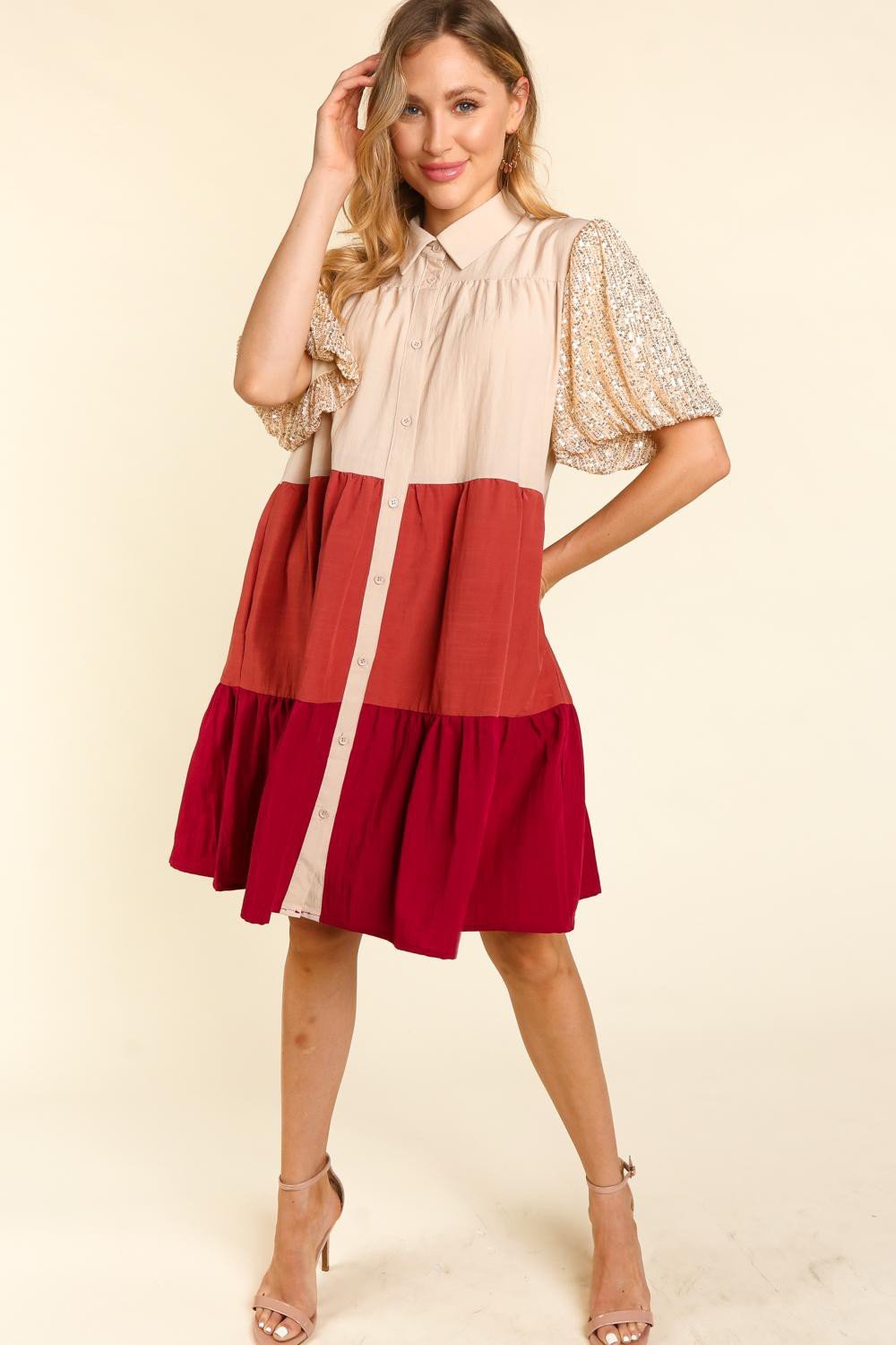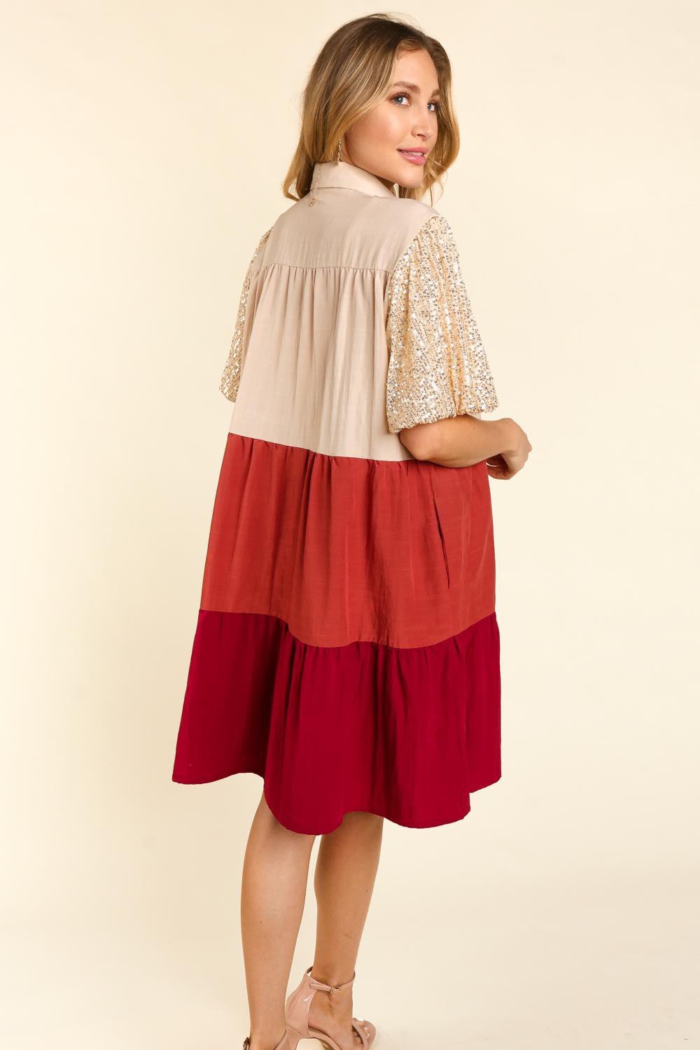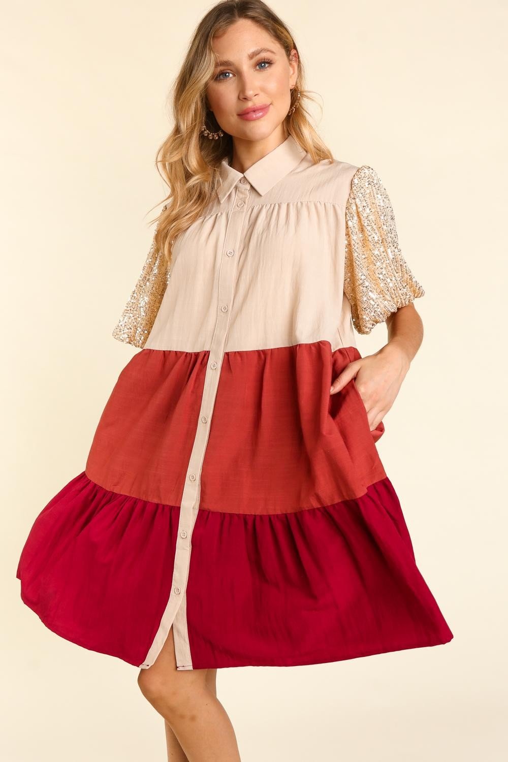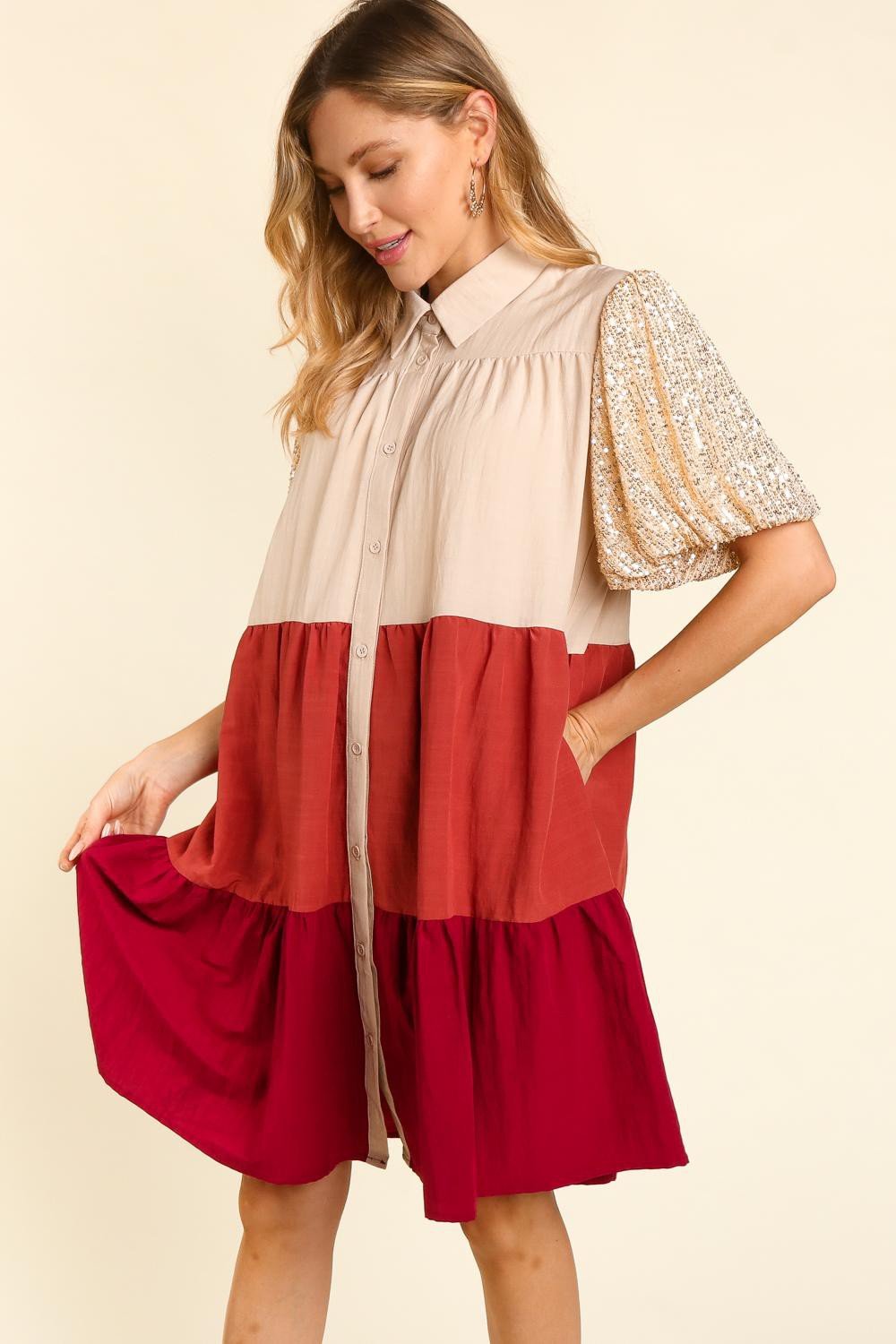 Sequins lined bubble short sleeve collared button down solid woven color block tiered baby doll midi length dress with side pockets.