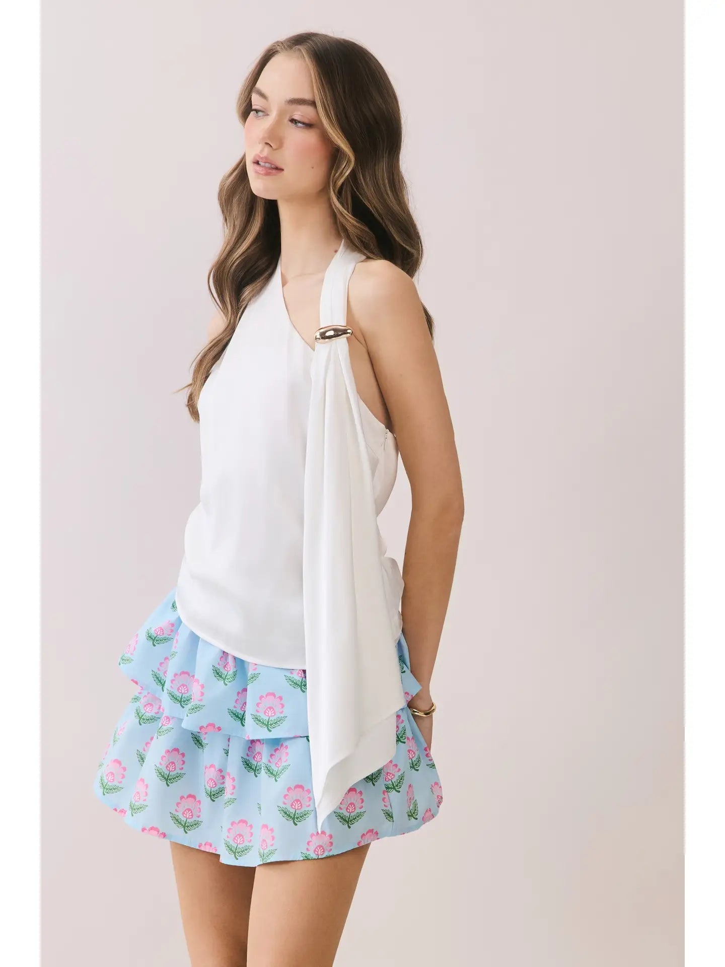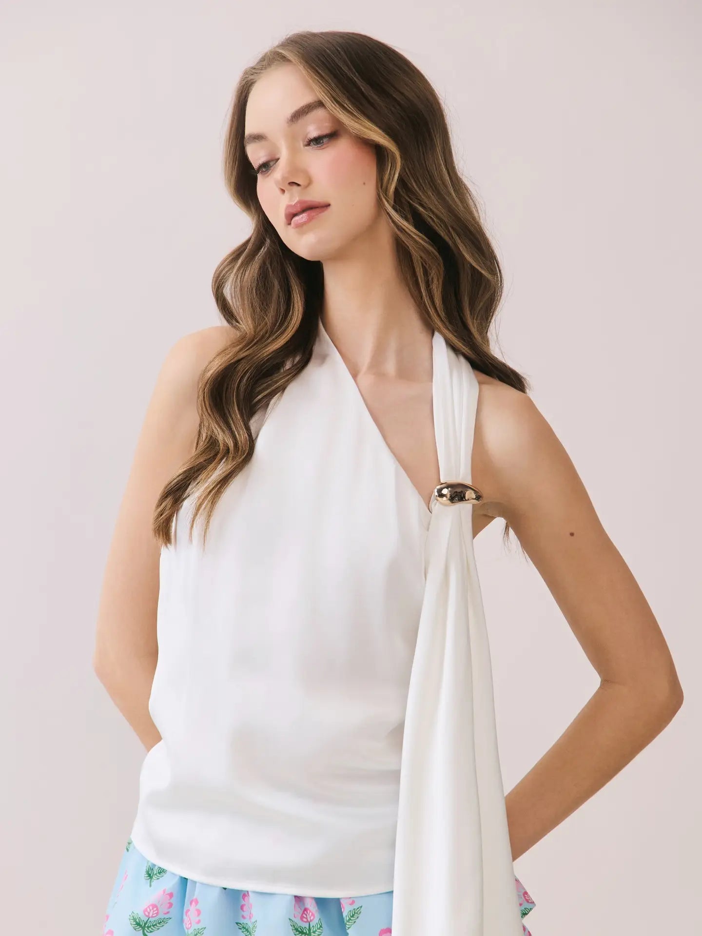 Gold Ring Accent Scarf Open Back White Halter Top