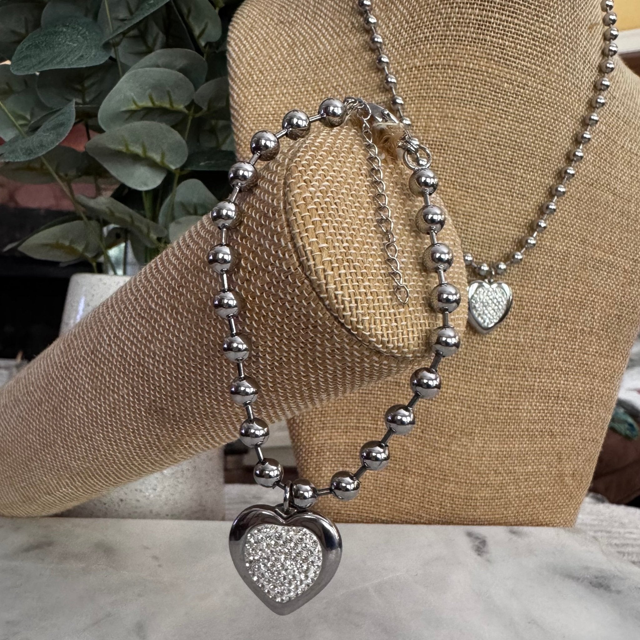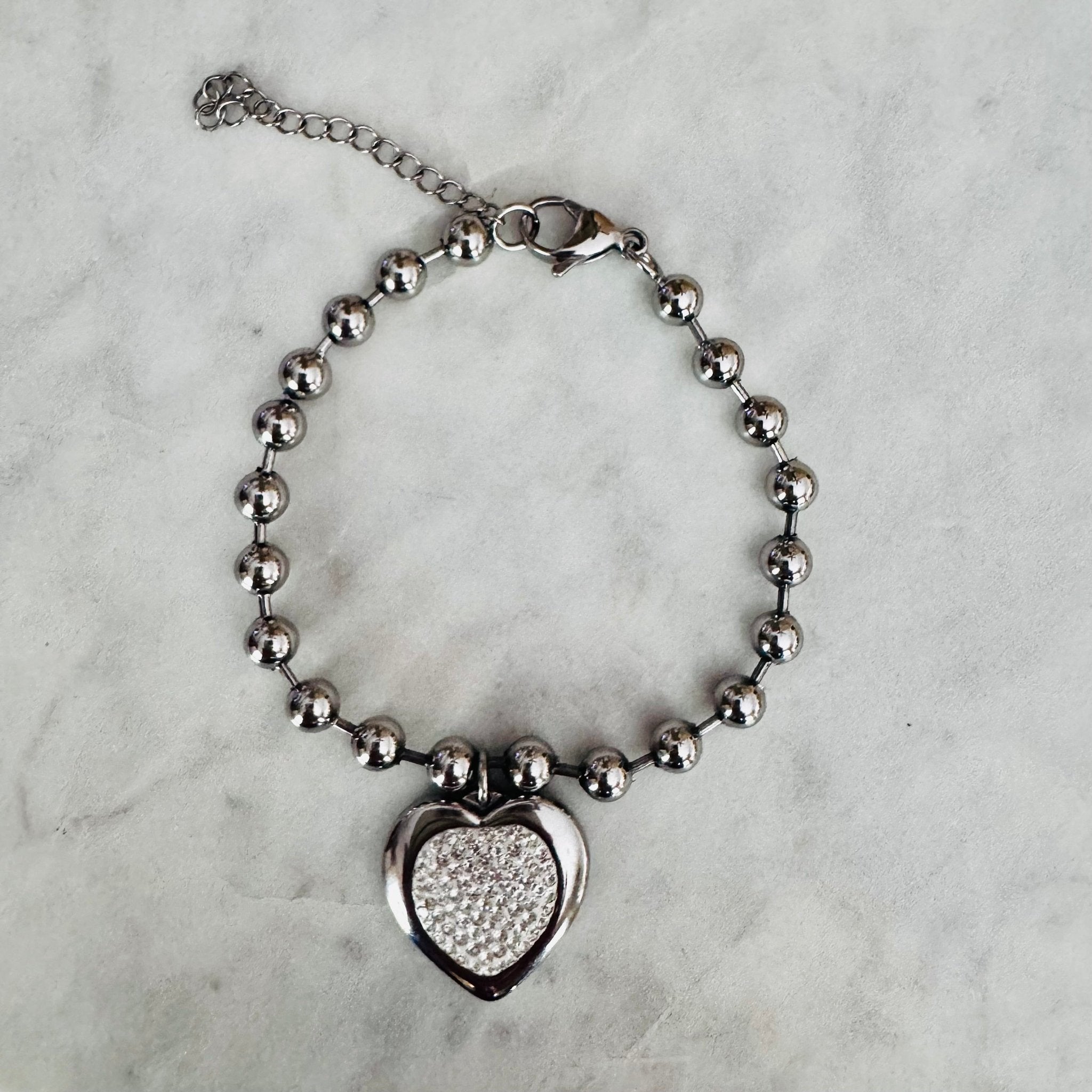 Silver Bead and Bar Bracelet with Pave’ Crystal Heart (Waterproof Tarnish-Resistant)