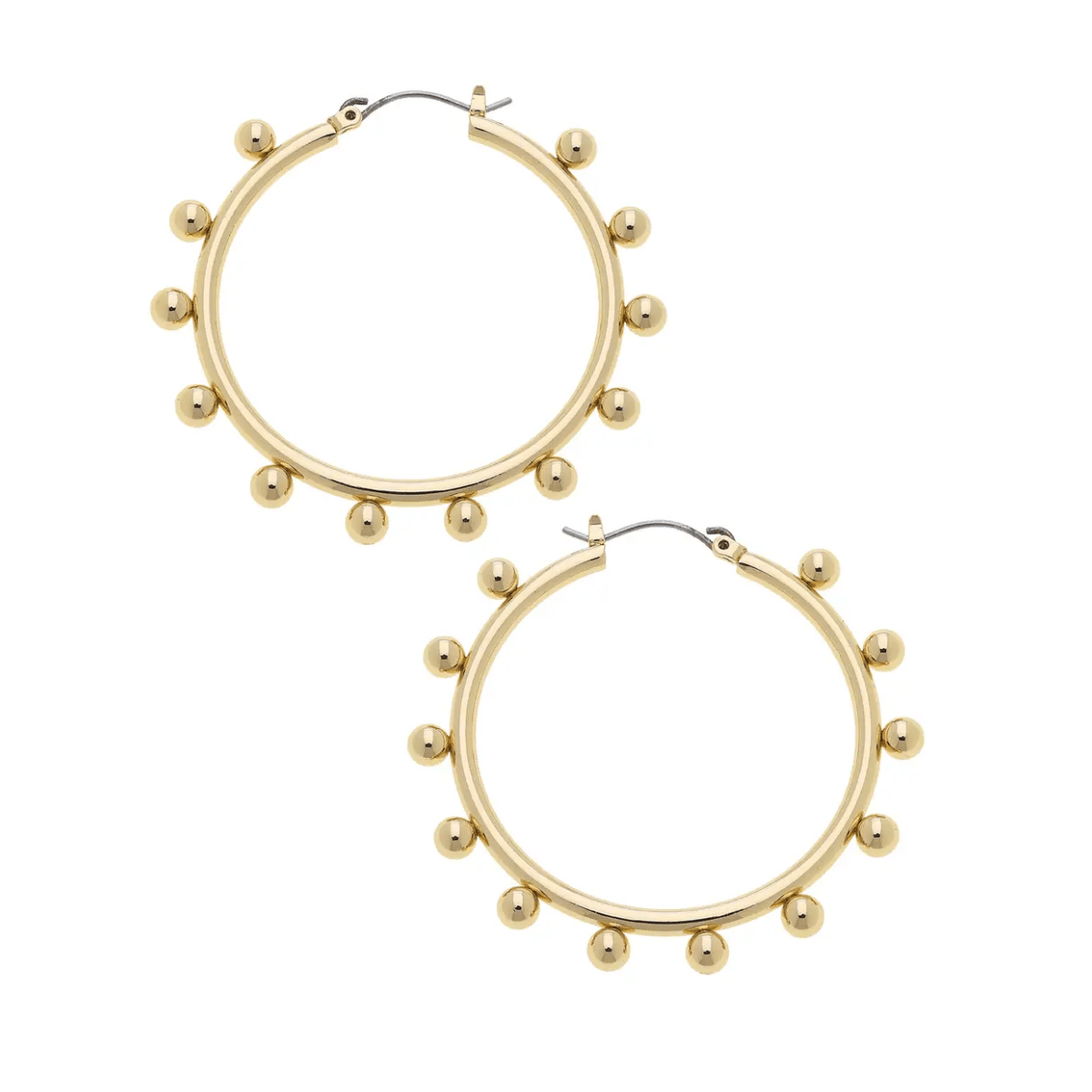 The Katie Ball Bead Hoop Earrings offer a playful take on classic hoops. Their shiny gold bead accents create a stylish and versatile design.