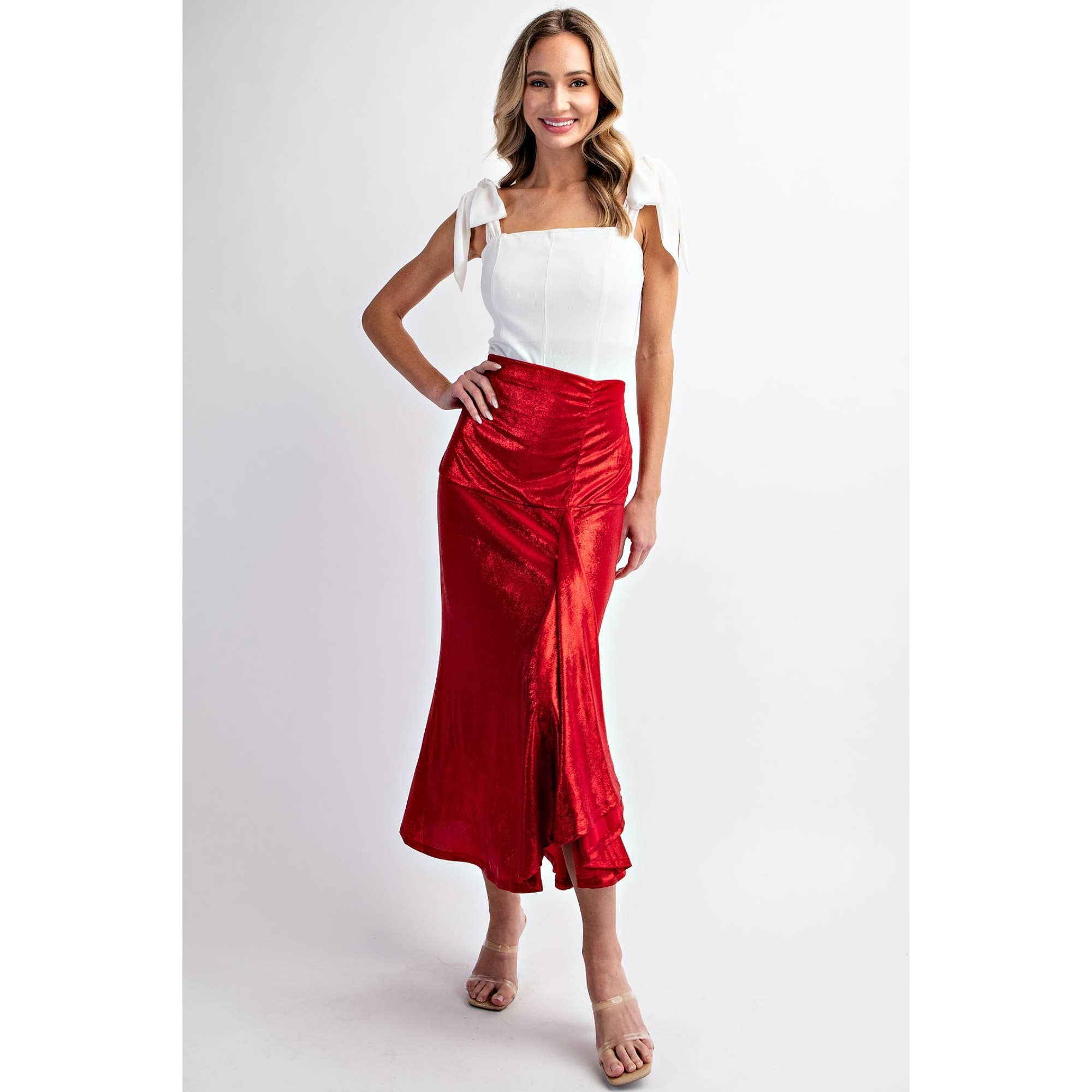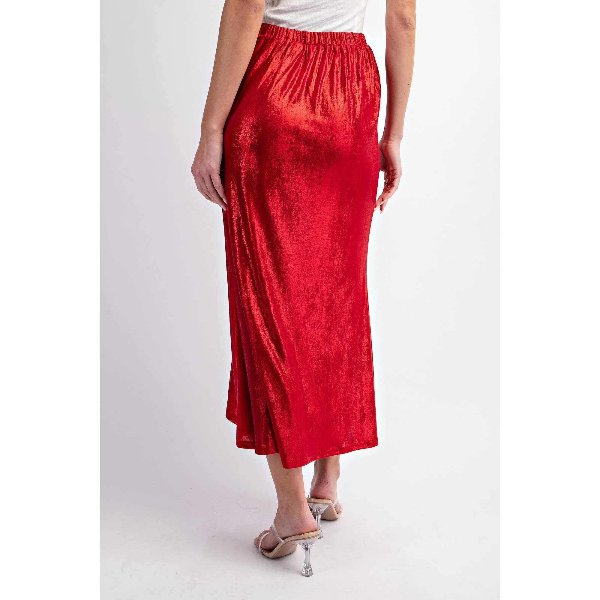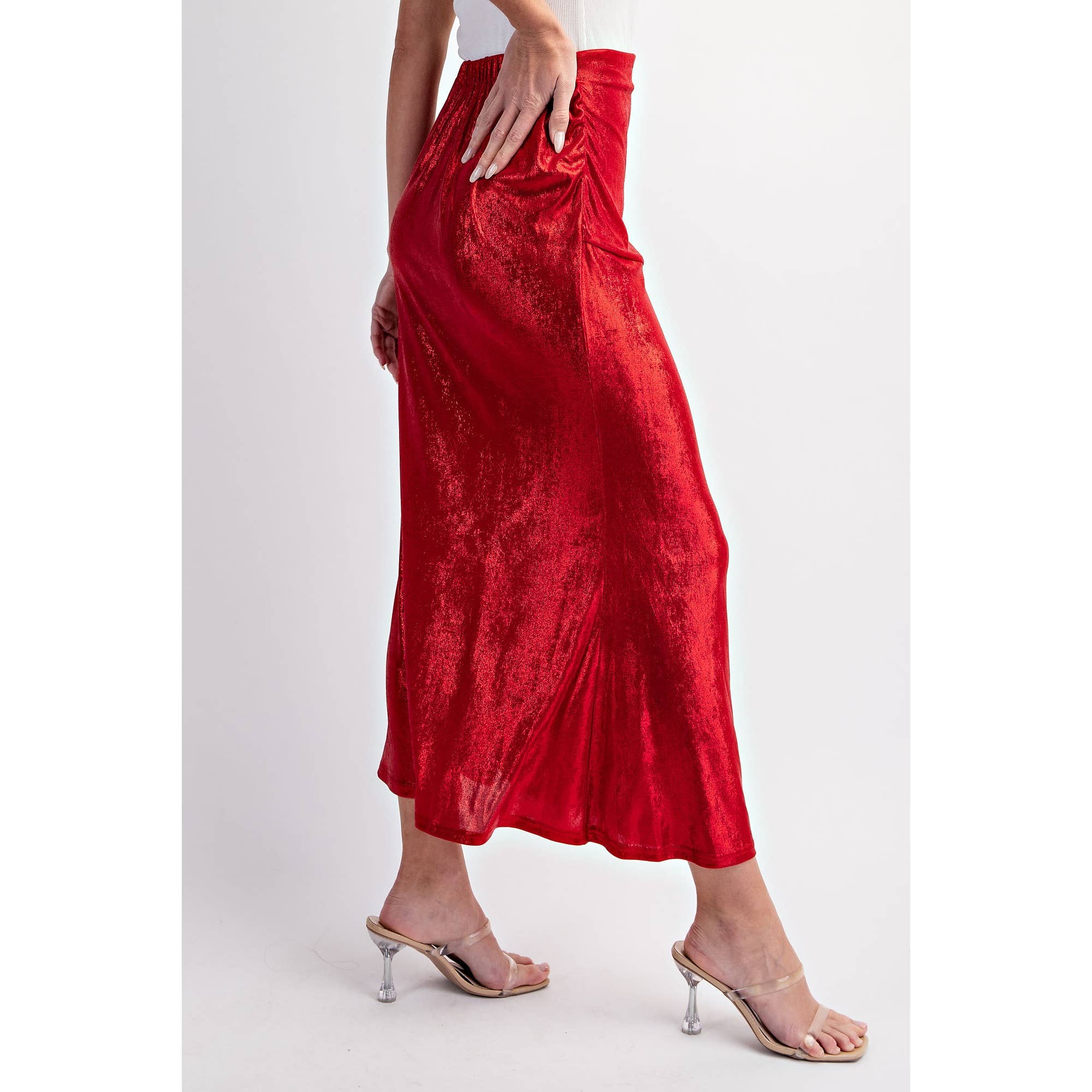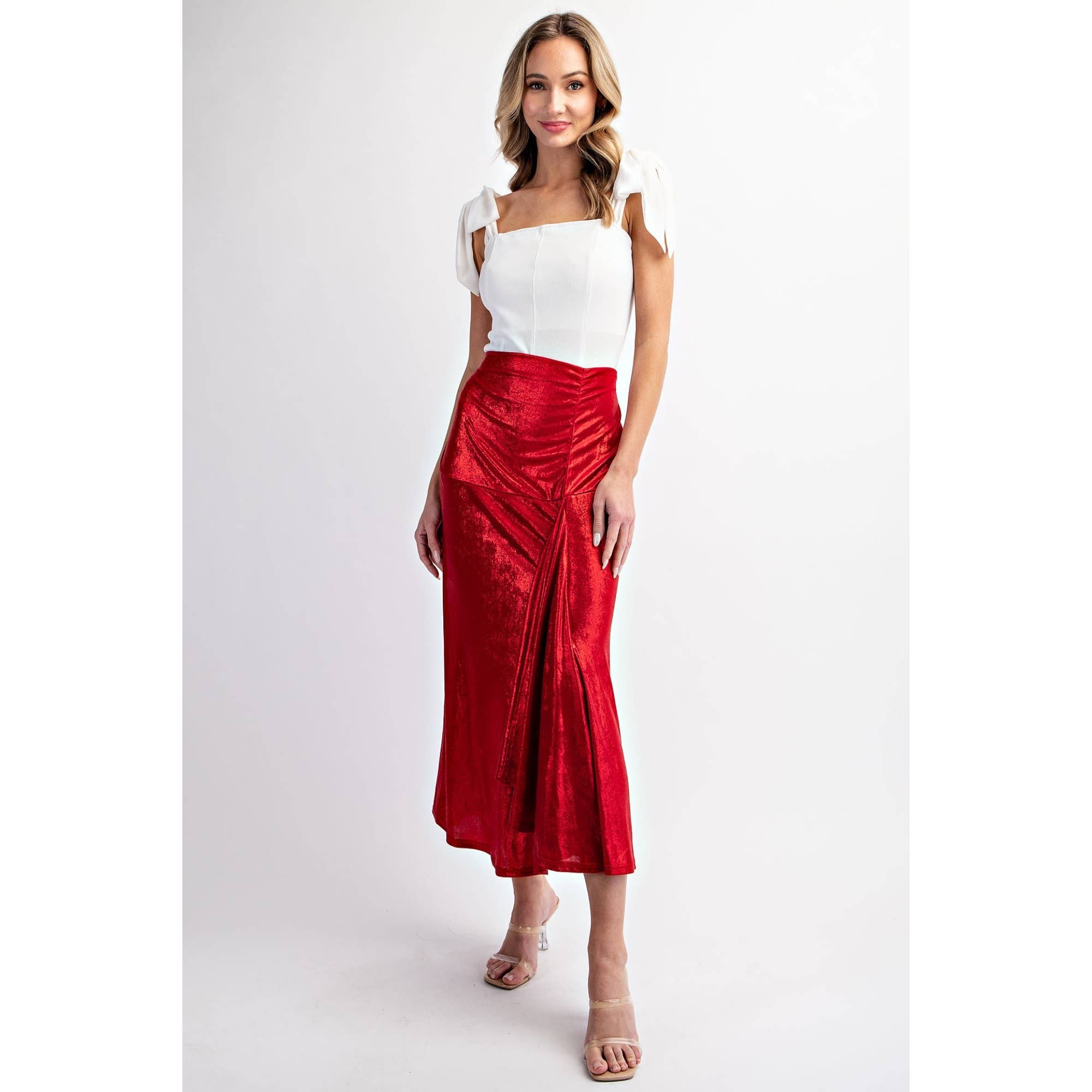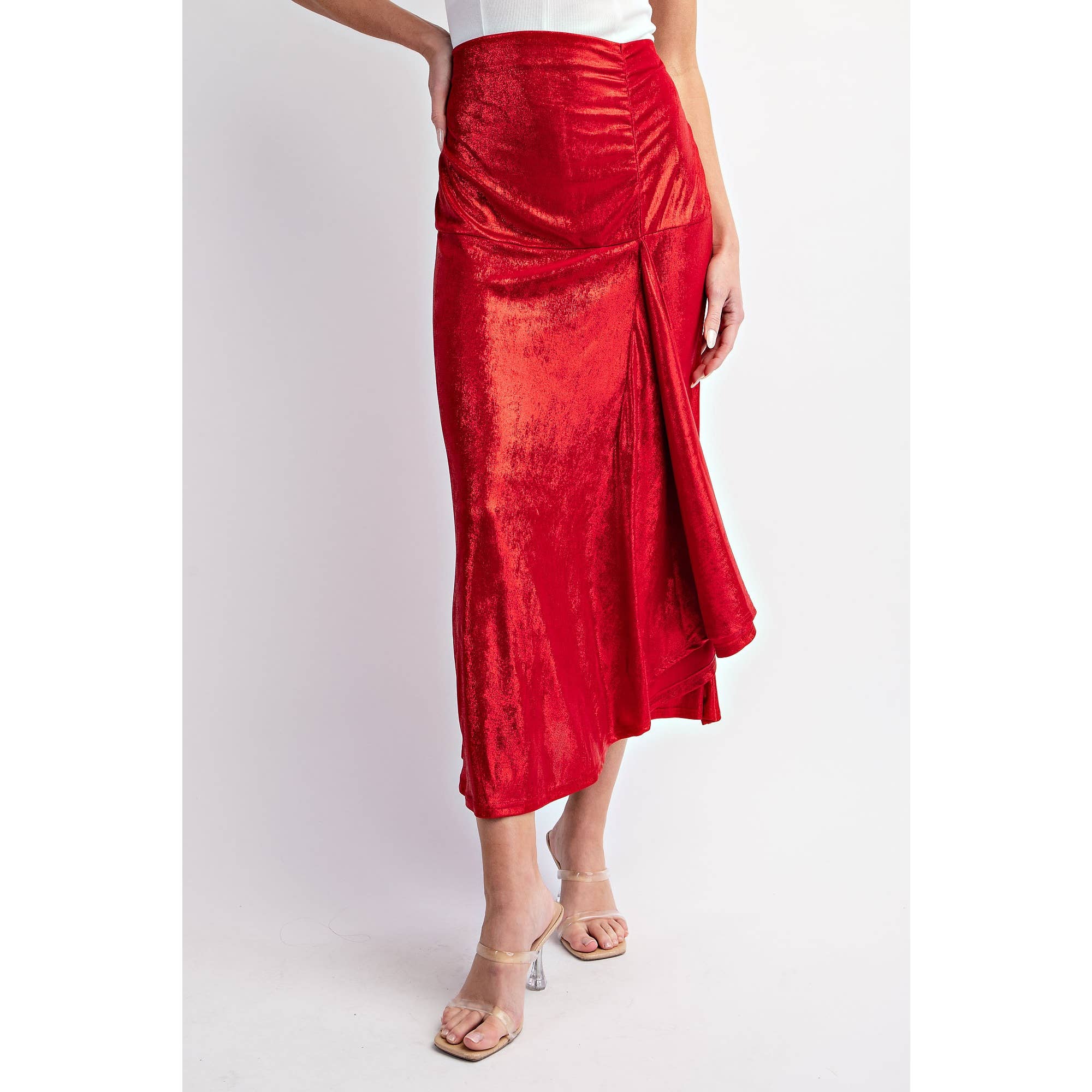 DEEP RED FOILED DRAPED MAXI SKIRT