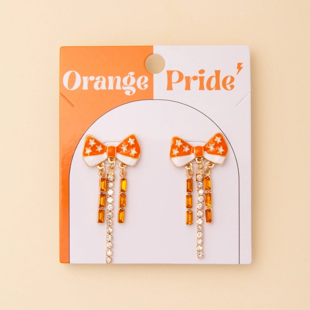 Dimensions Height: 2" Width: 1" Key Features Shine with spirit in these crystal rhinestone-embellished chevron bow dangle earrings, designed with a playful tiered silhouette that sways with every cheer.