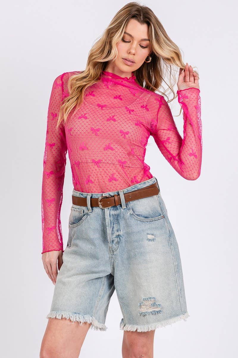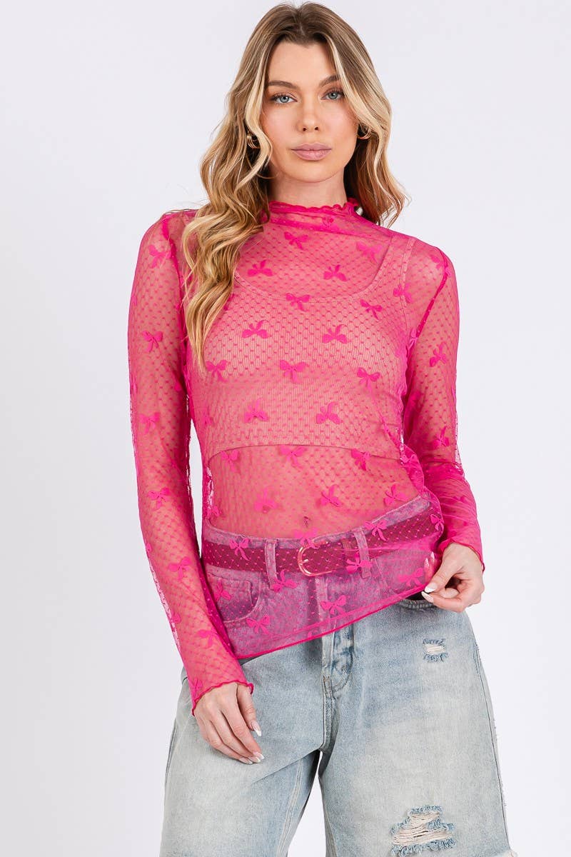 PINK BOW PRINT LONG SLEEVE LACE TOP