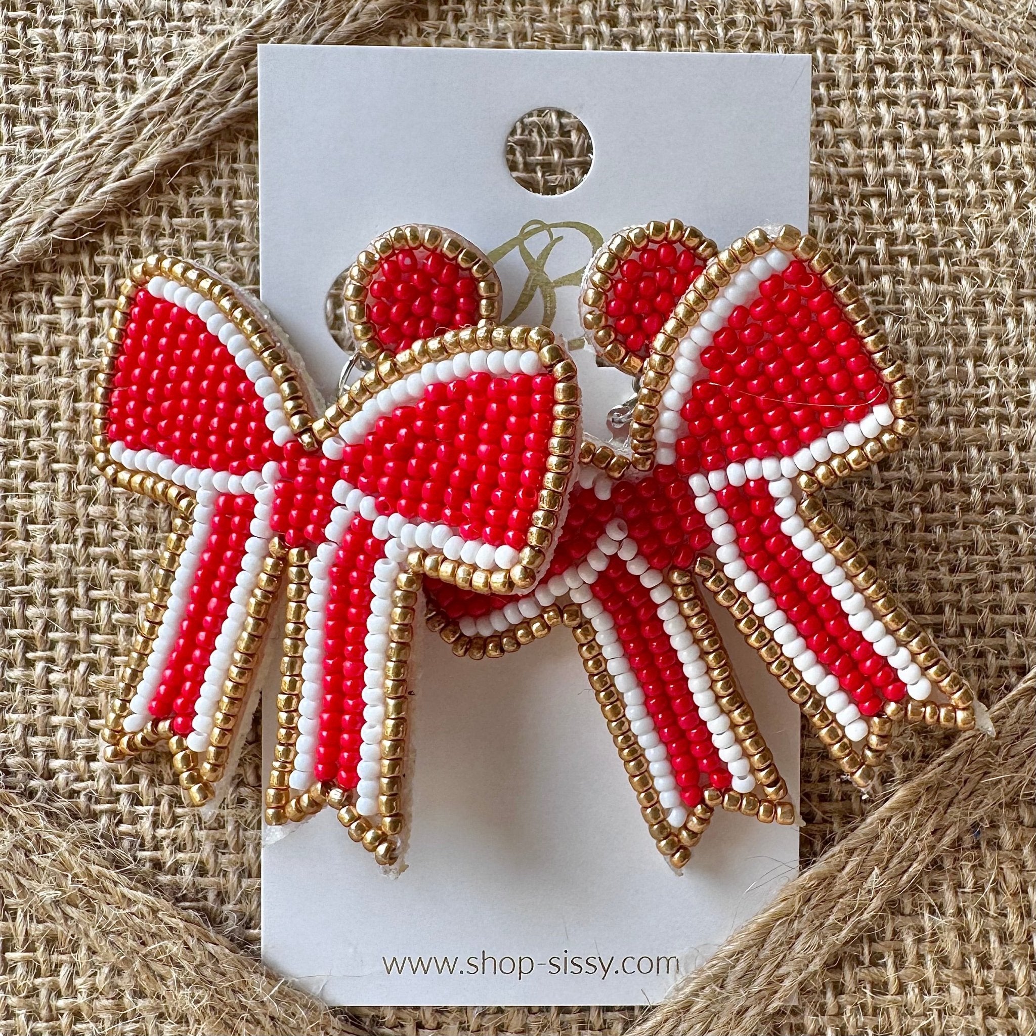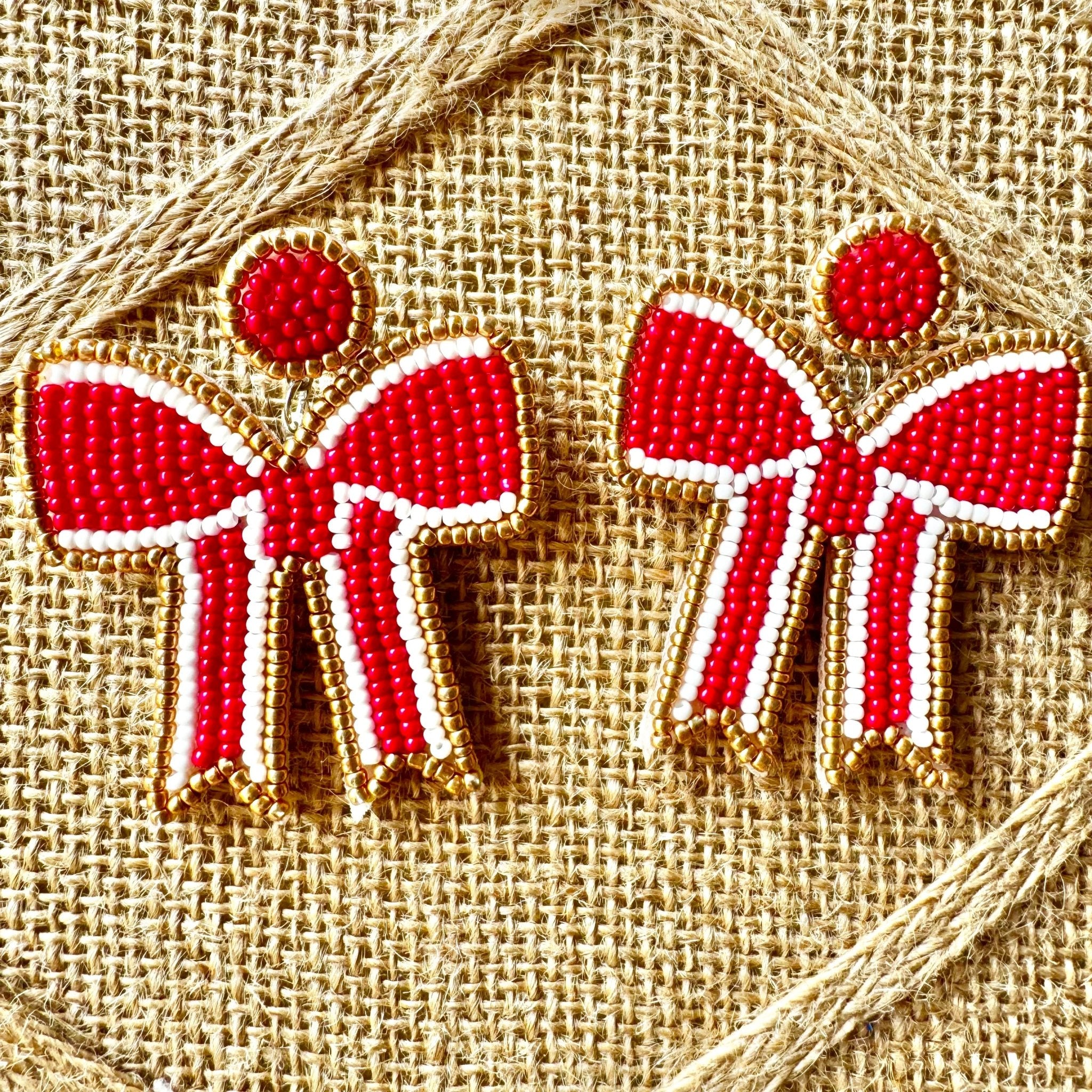 Red with White and Gold Trim Seedbead Coquette Bow Earrings