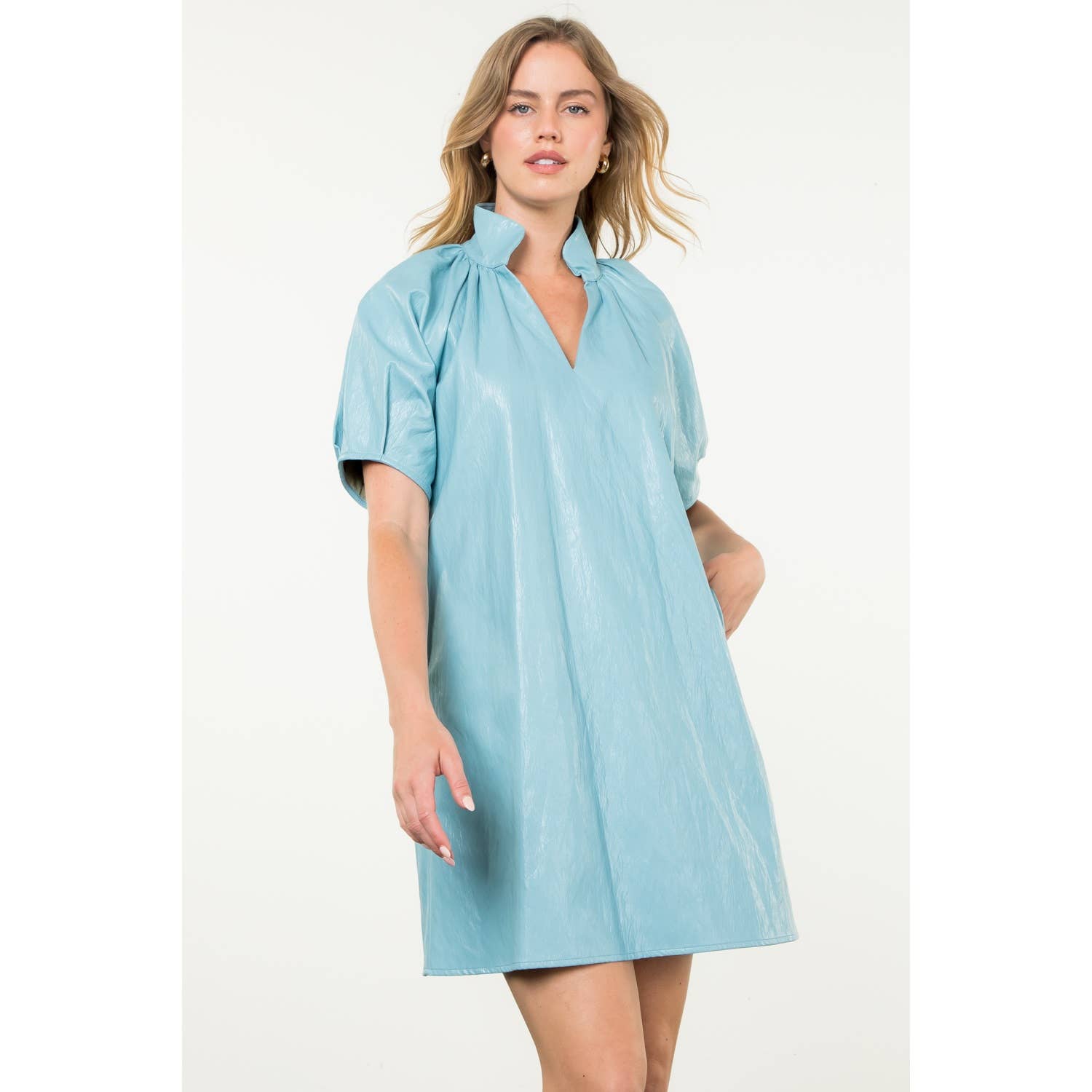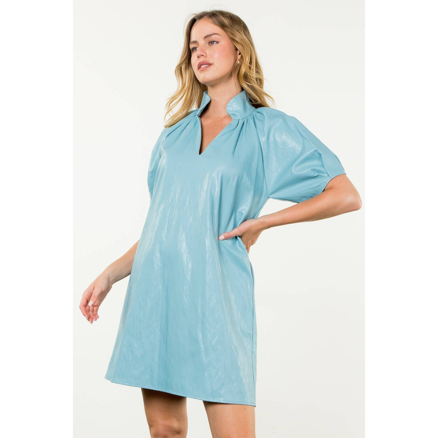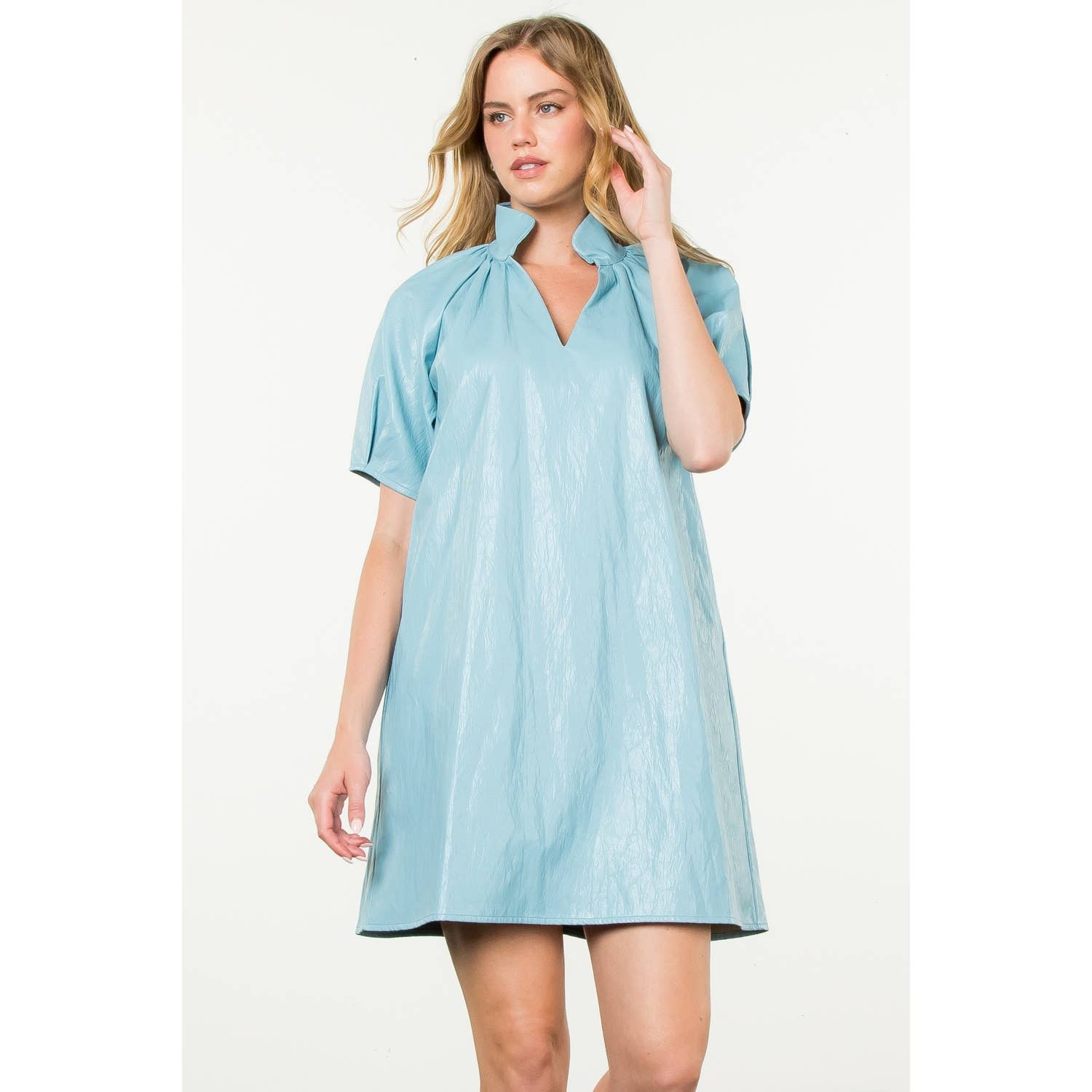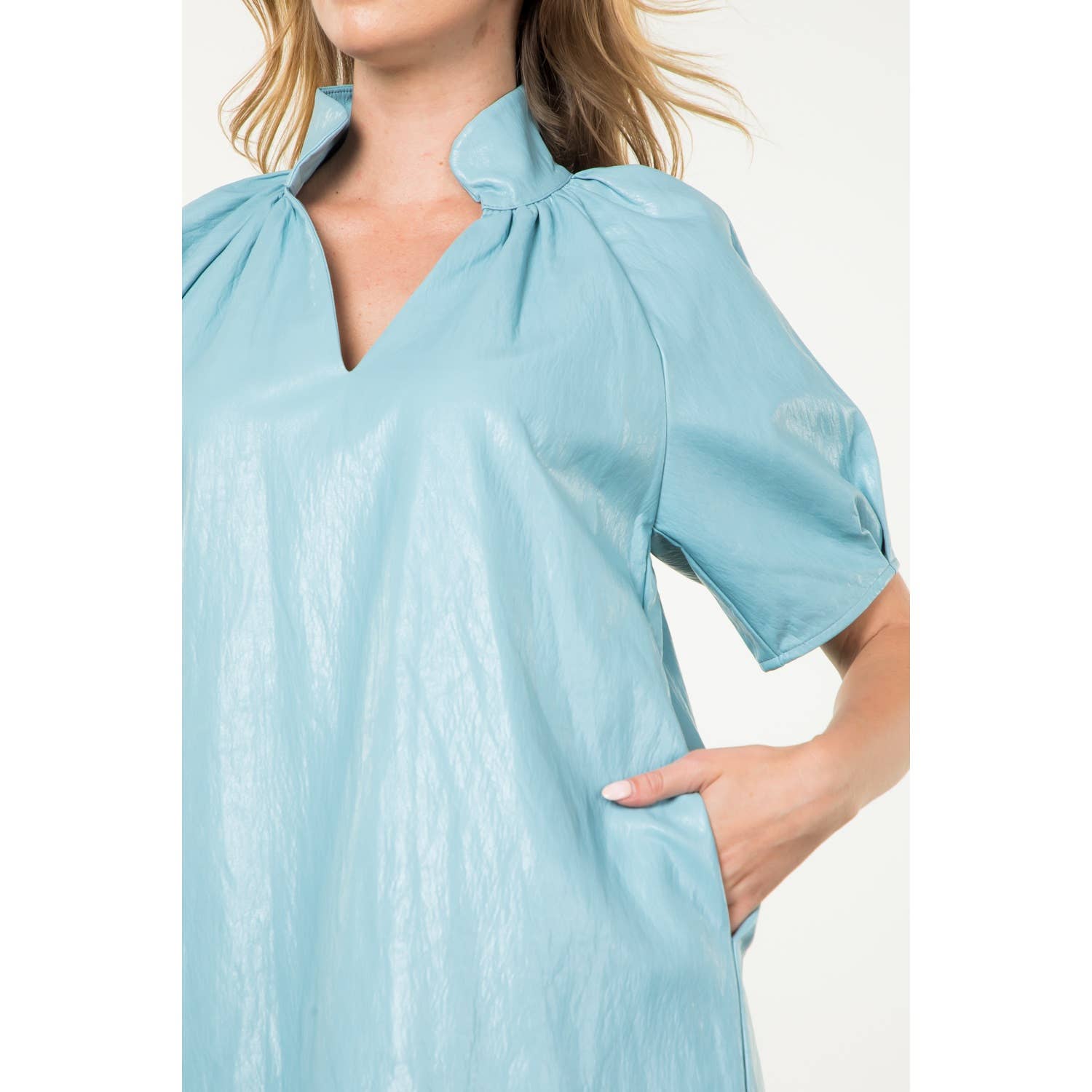Introducing the Baby Blue Short Sleeve Leather Midi Dress, a stunning fusion of elegance and modernity. Crafted from a unique blend of 50% polyurethane, 45% polyester, and 5% metallic wire, this dress offers a luxurious feel while ensuring durability.