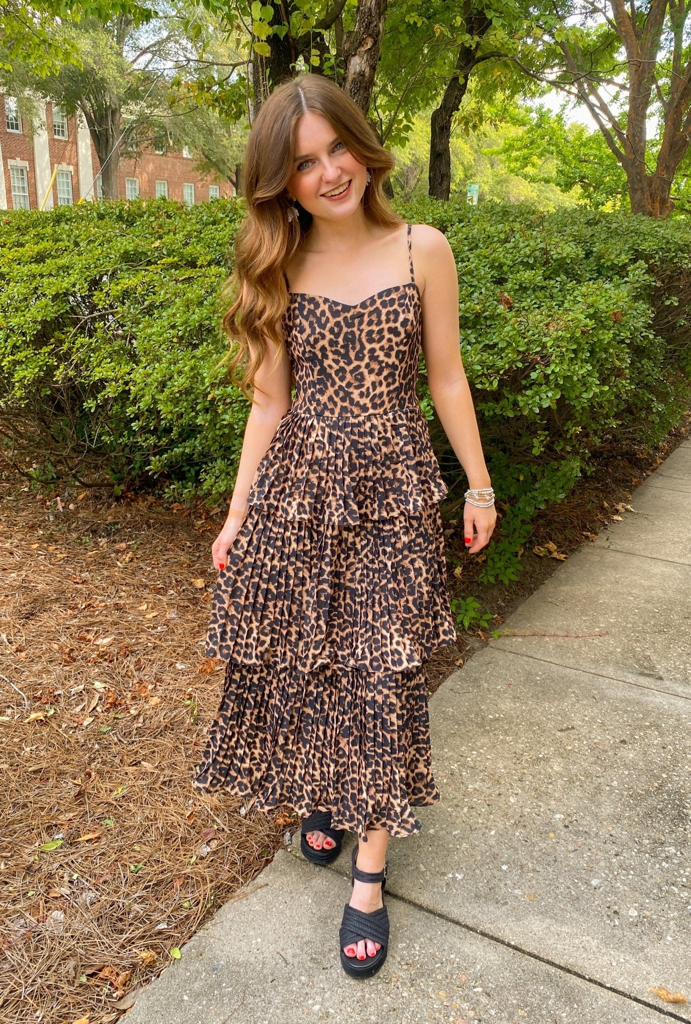 This leopard print midi dress features a sweetheart neckline, adjustable spaghetti straps, and a smocked back for a flexible fit. Designed with tiered ruffles throughout for added volume and movement.