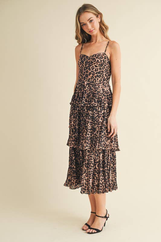 TCEC Leopard Print Sweetheart Neckline Tiered Ruffled Midi Dress