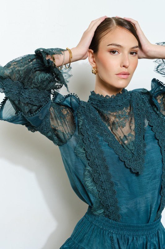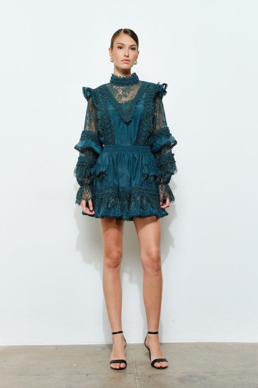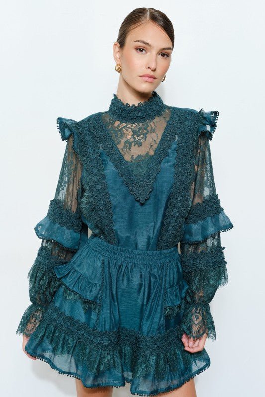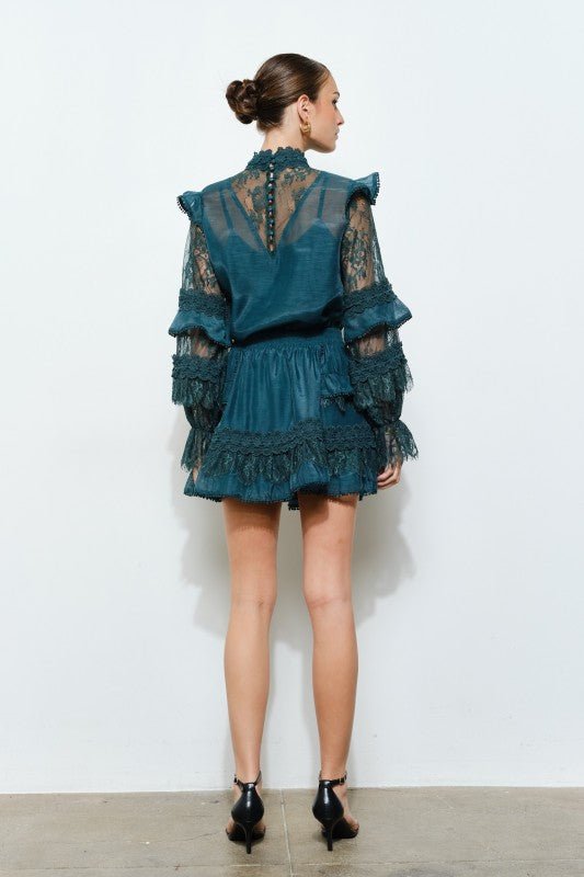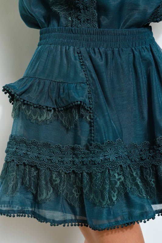 Teal Floral Lace Trim Tiered Mini Skirt