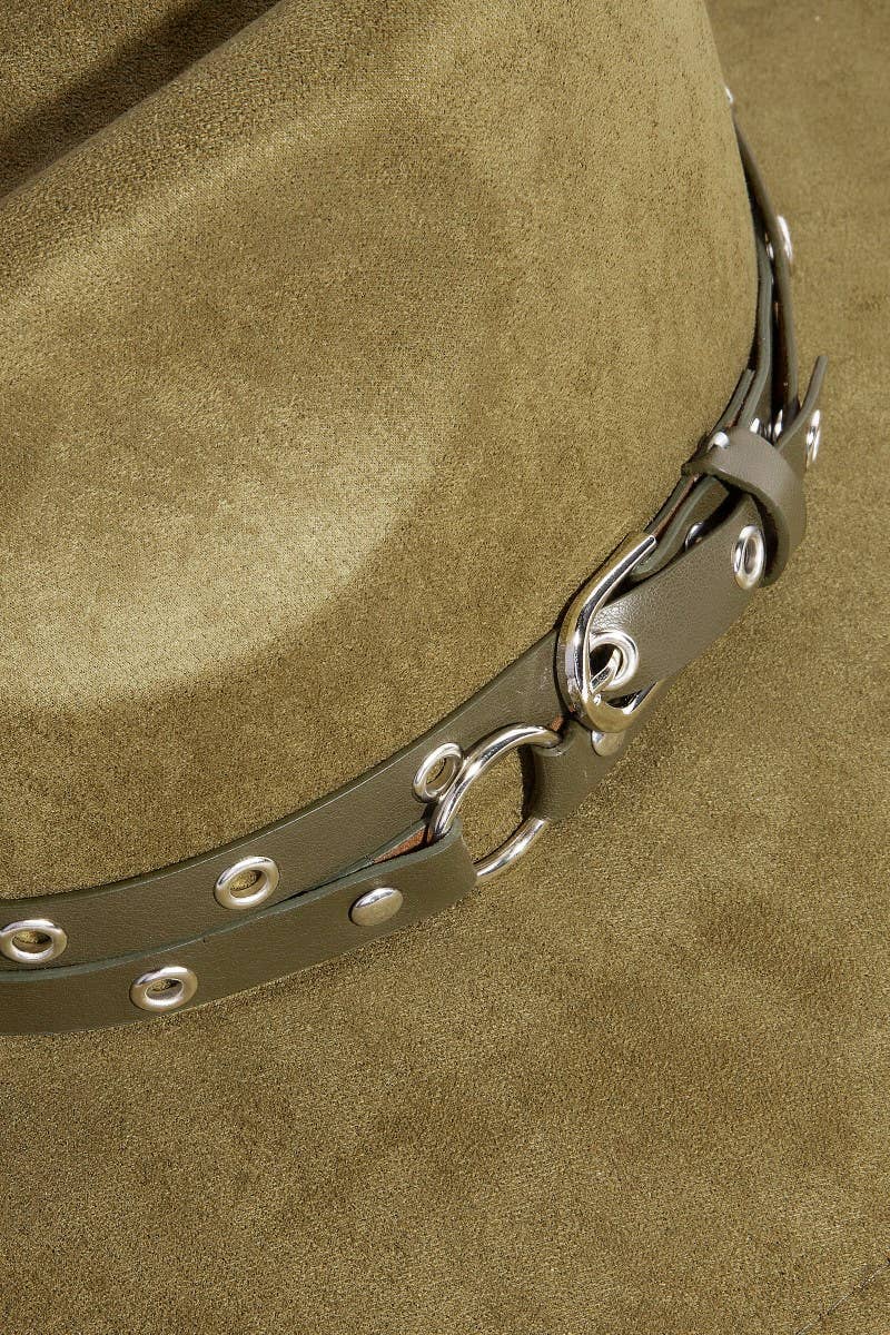 Effortlessly elevate your style, this fedora hat boasts a magnificent double grommet strap faux suede design. This fedora hat is a great way to add some flair to your outfit without going over the top. Available in BK, IV, KA, OL. This item is sold in packs of 1.