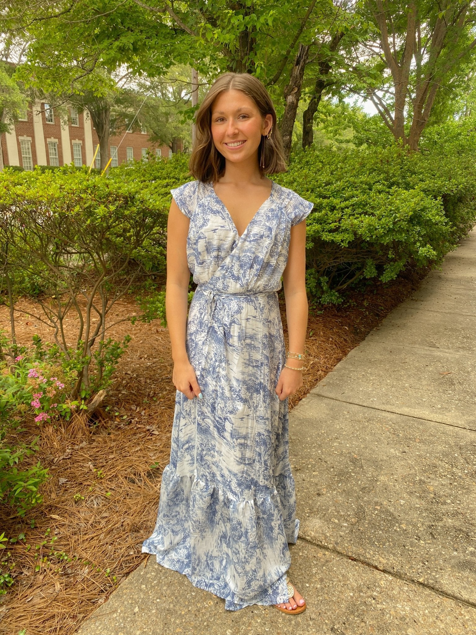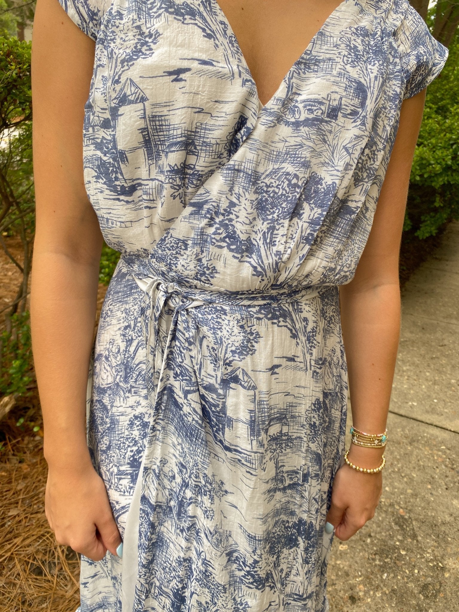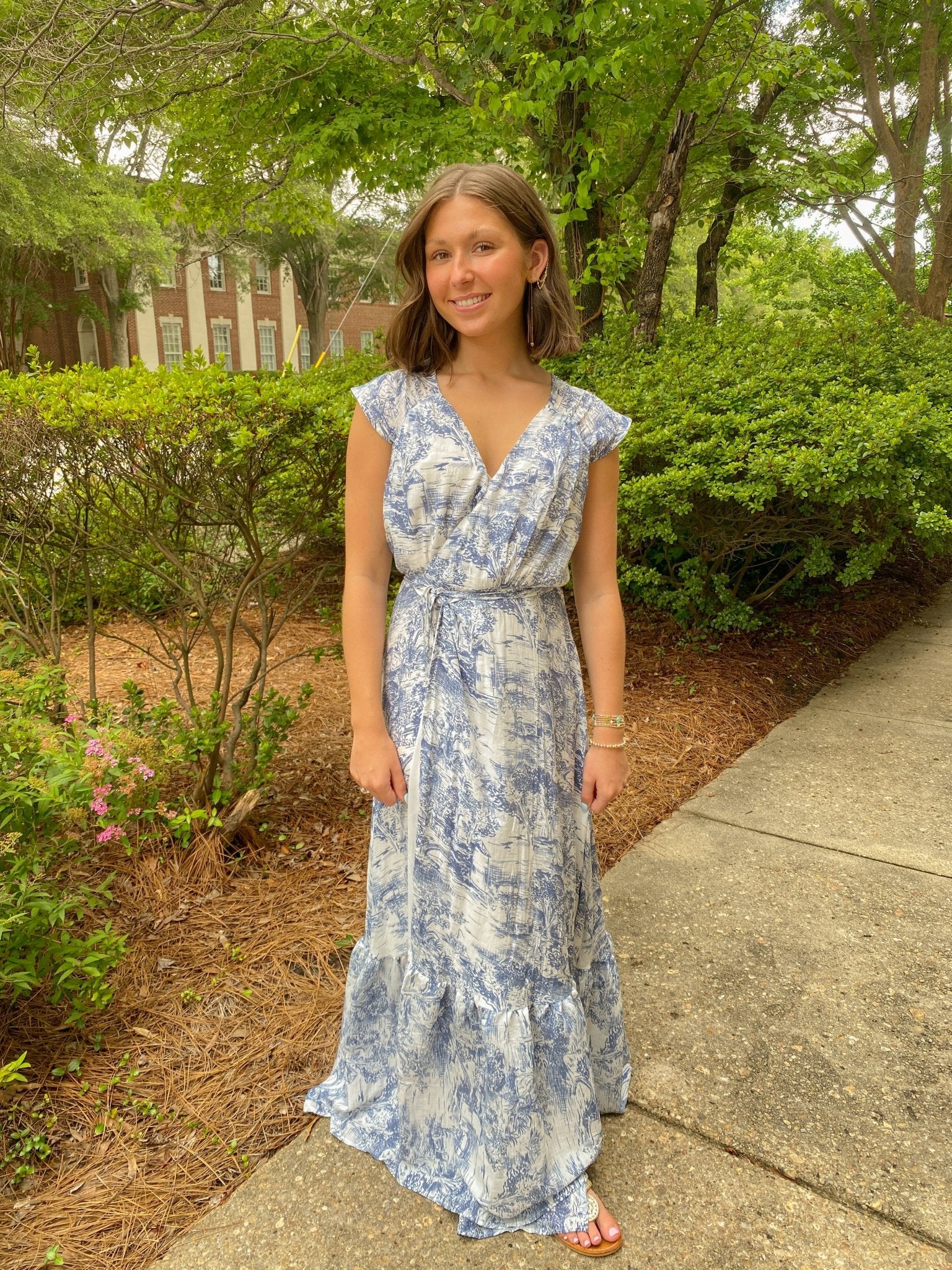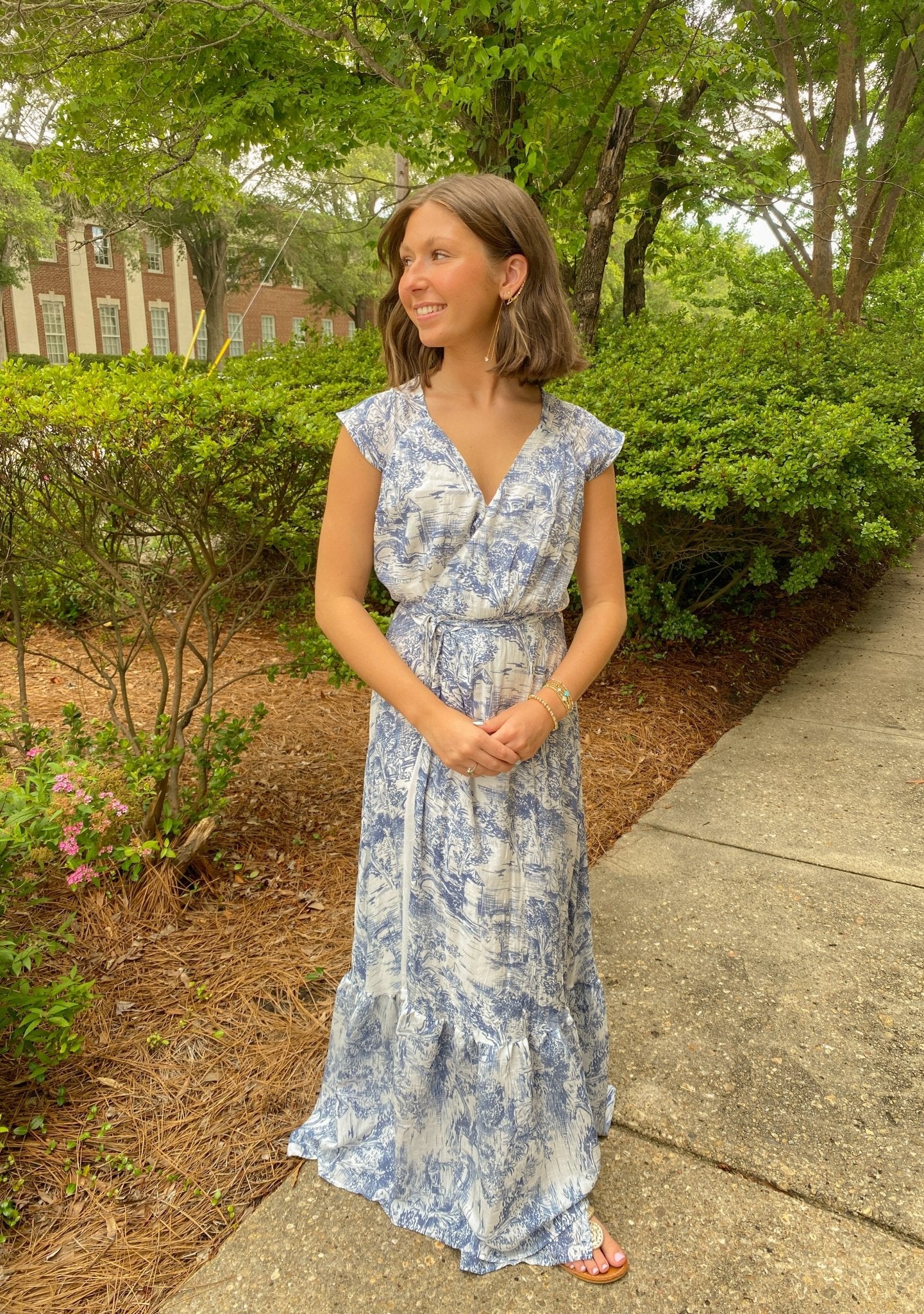 Off White And Blue Cap Sleeve Wrap Maxi Dress