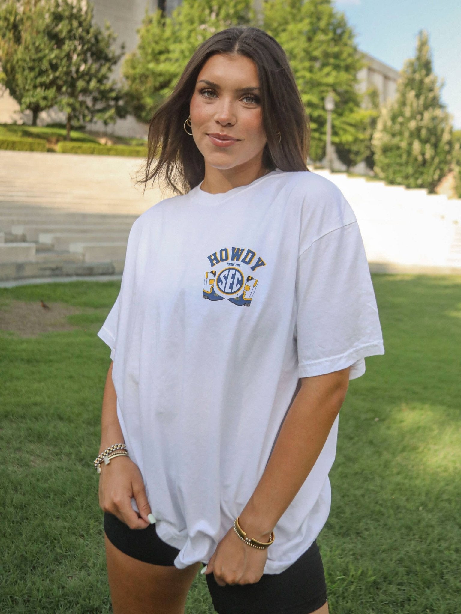 Howdy from the SEC - where it just means more! This bestselling unisex style is on a white Comfort Colors tee and features a front and back graphic complete with a cowboy boot repping every school in the SEC - even the newbies.