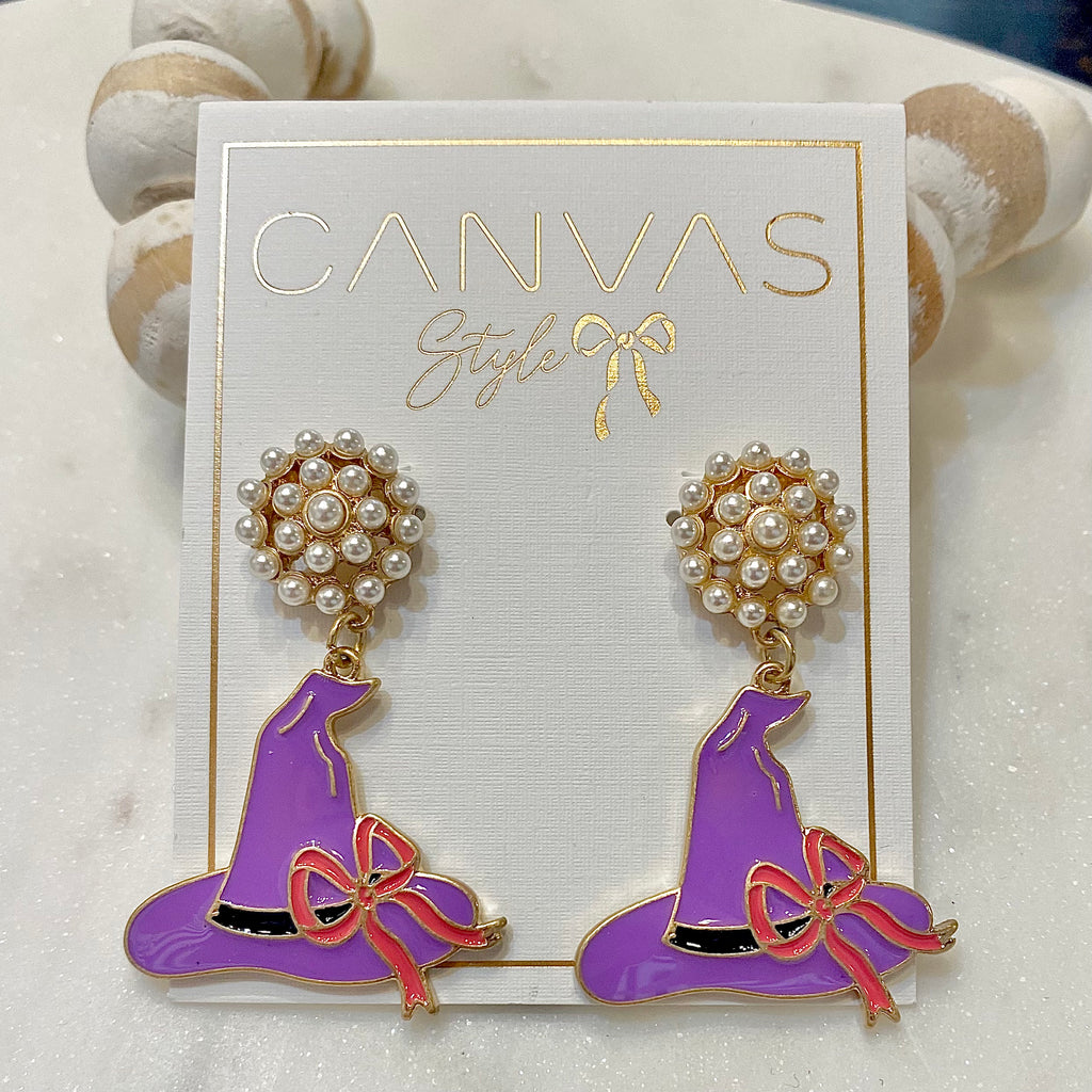HALLOWEEN ENAMEL WITCH HAT EARRINGS IN PURPLE