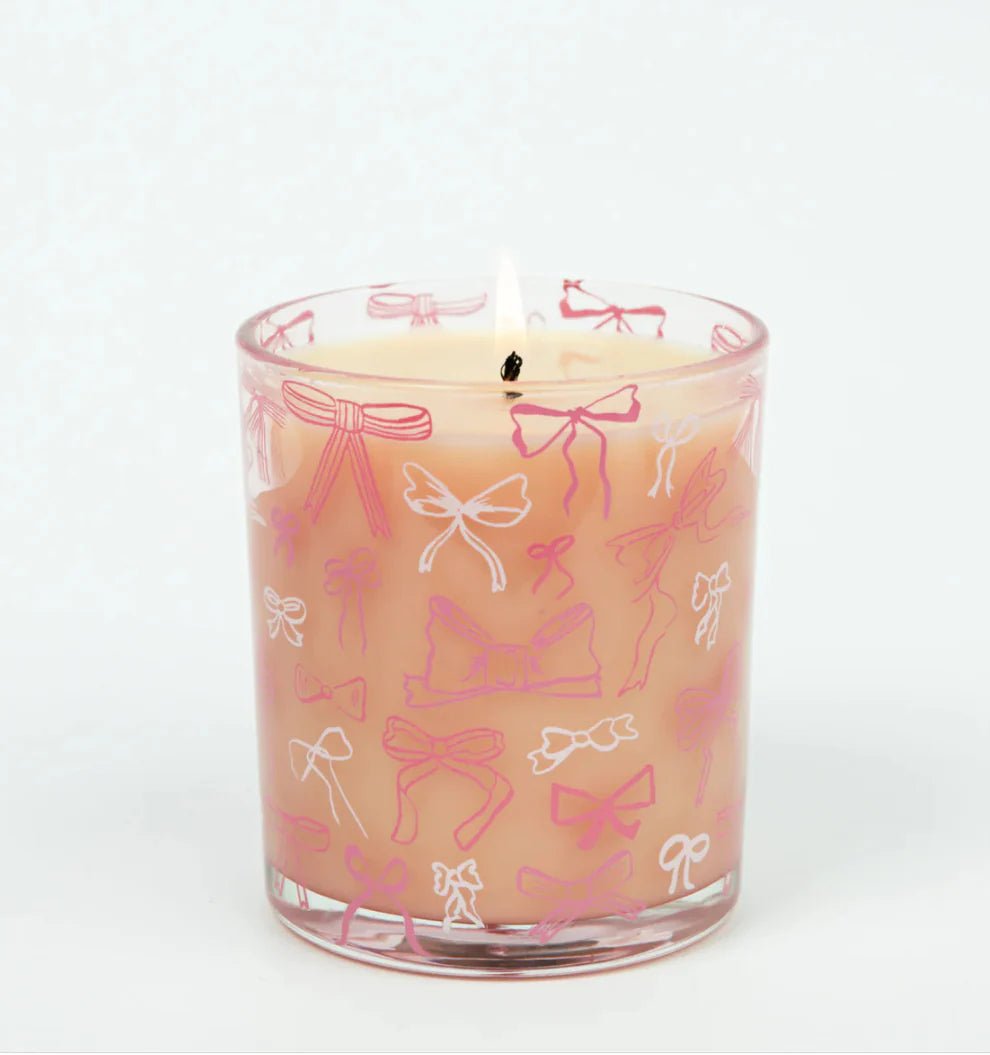 Add a touch of sweetness with the Sweet Grace Bow Candle! This adorable candle features pink and white bow decals on a clear glass jar, creating the perfect playful, pink-girl aesthetic. Filled with a soy-blend wax and our best-selling Sweet Grace fragrance, it offers up to 72 hours of burn time.
