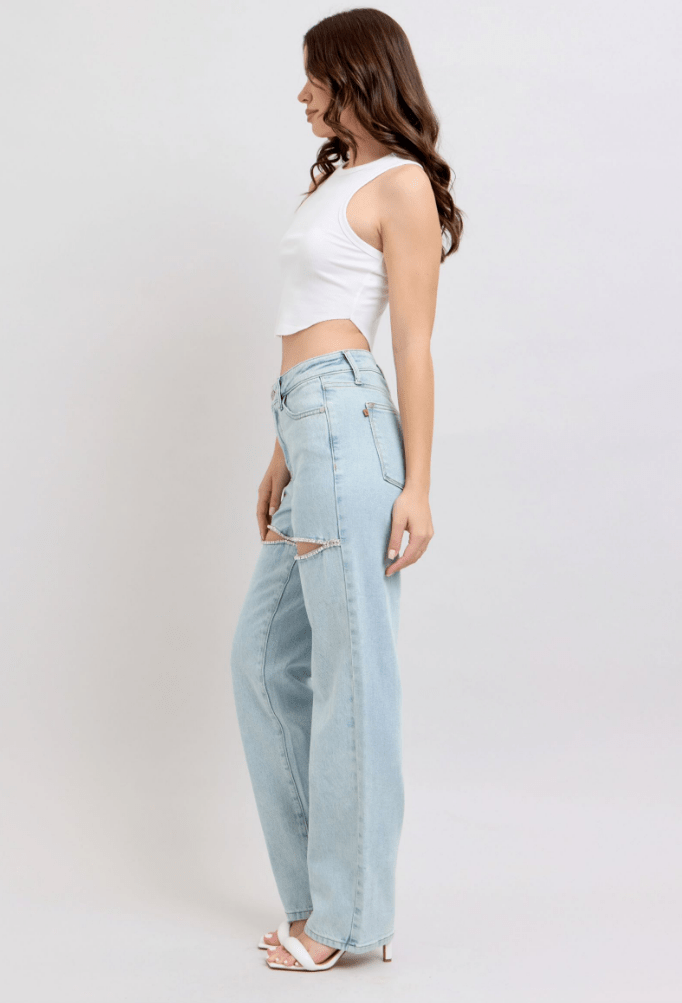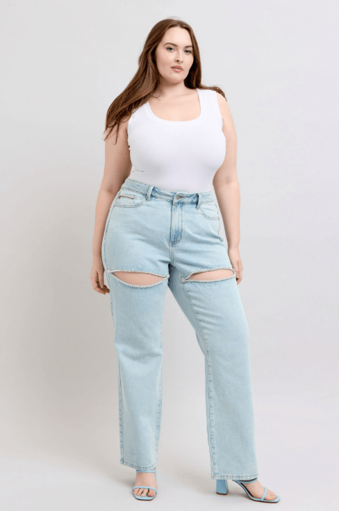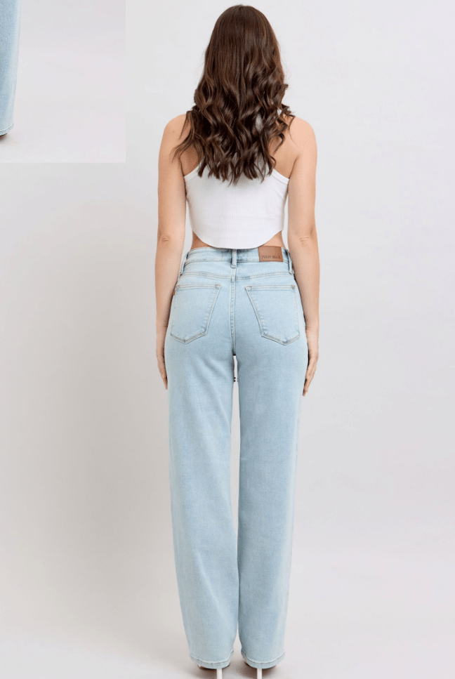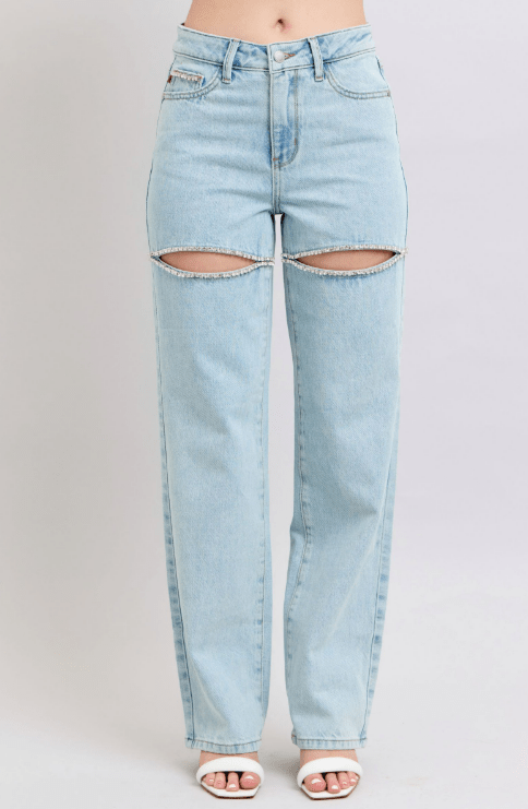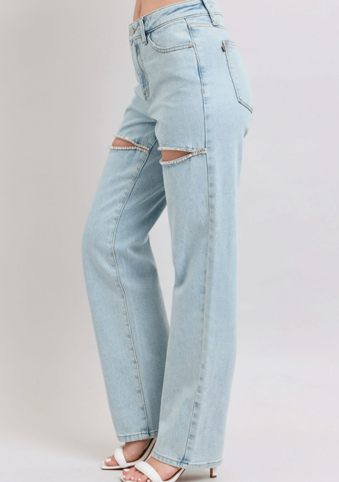 Judy Blue High Waisted Magic Rhinestone Front Slit Light Denim Straight Jeans Sizes 0 through 24W