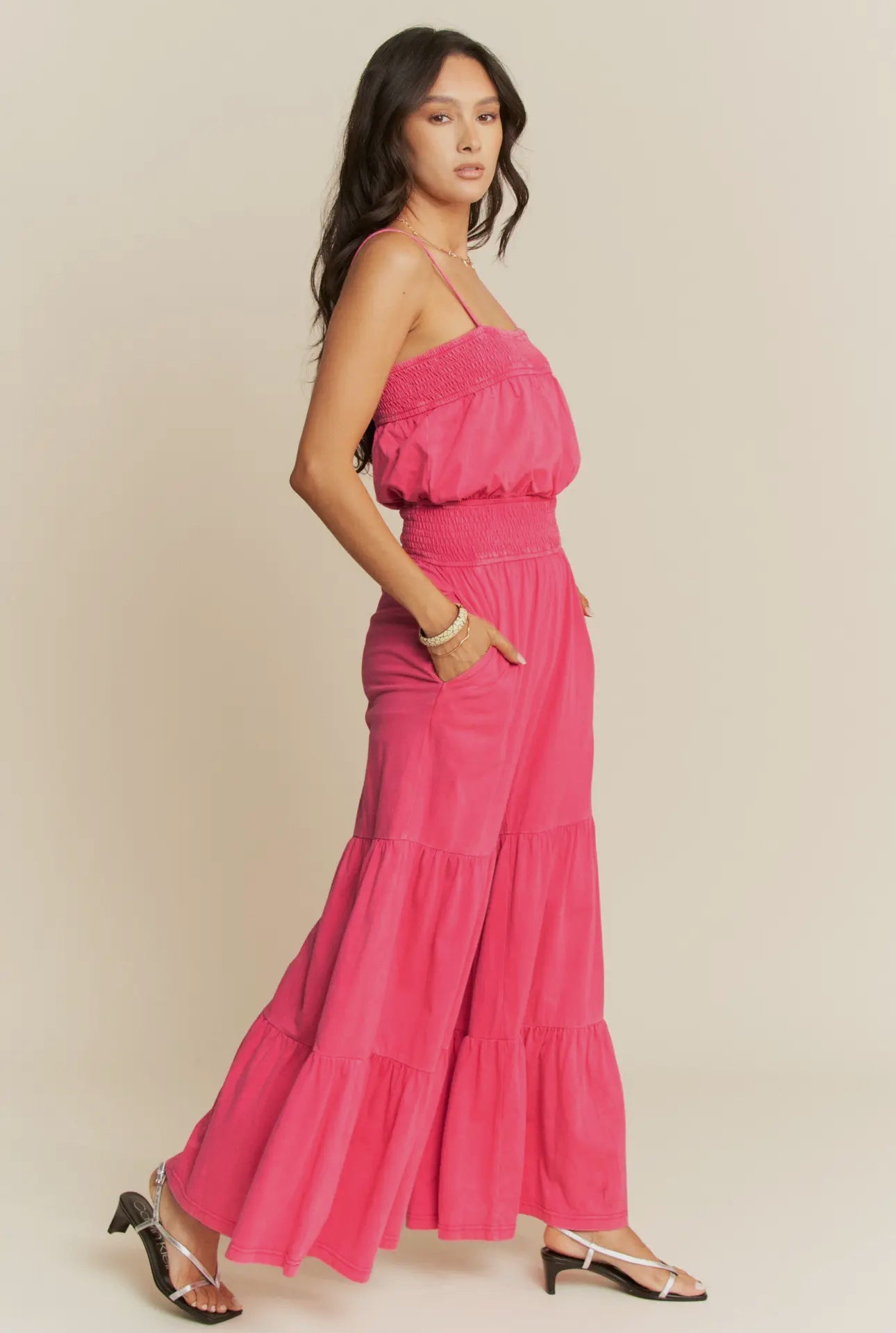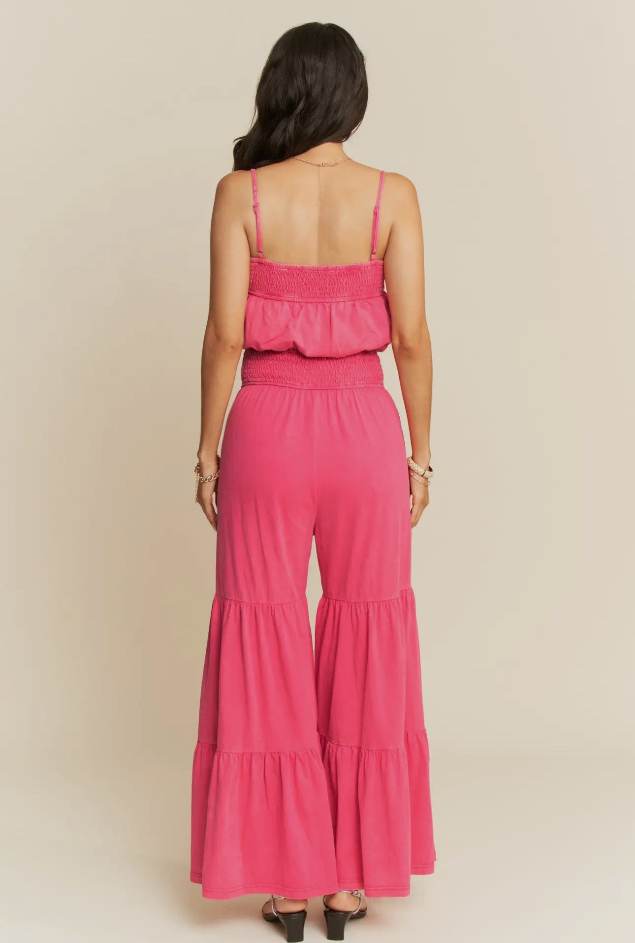 MINERAL WASHED SOFT KNIT SMOCKING NECK AND WAIST WIDE-OPEN LEG TIERED JUMPSUIT
