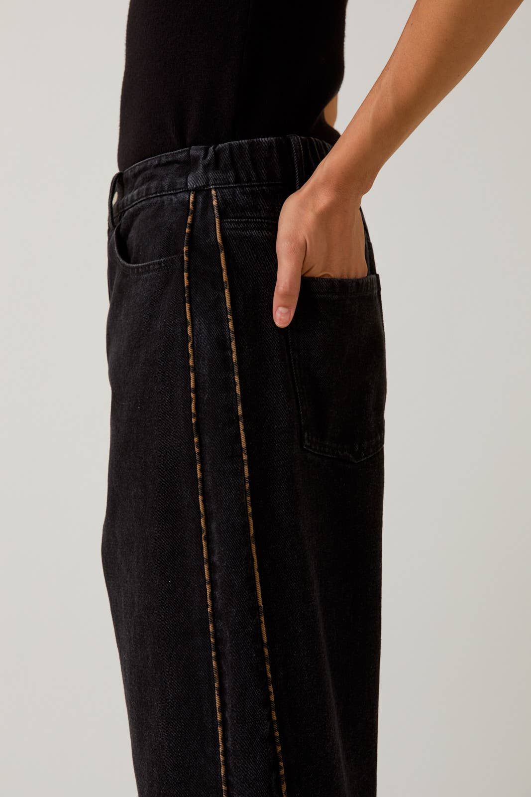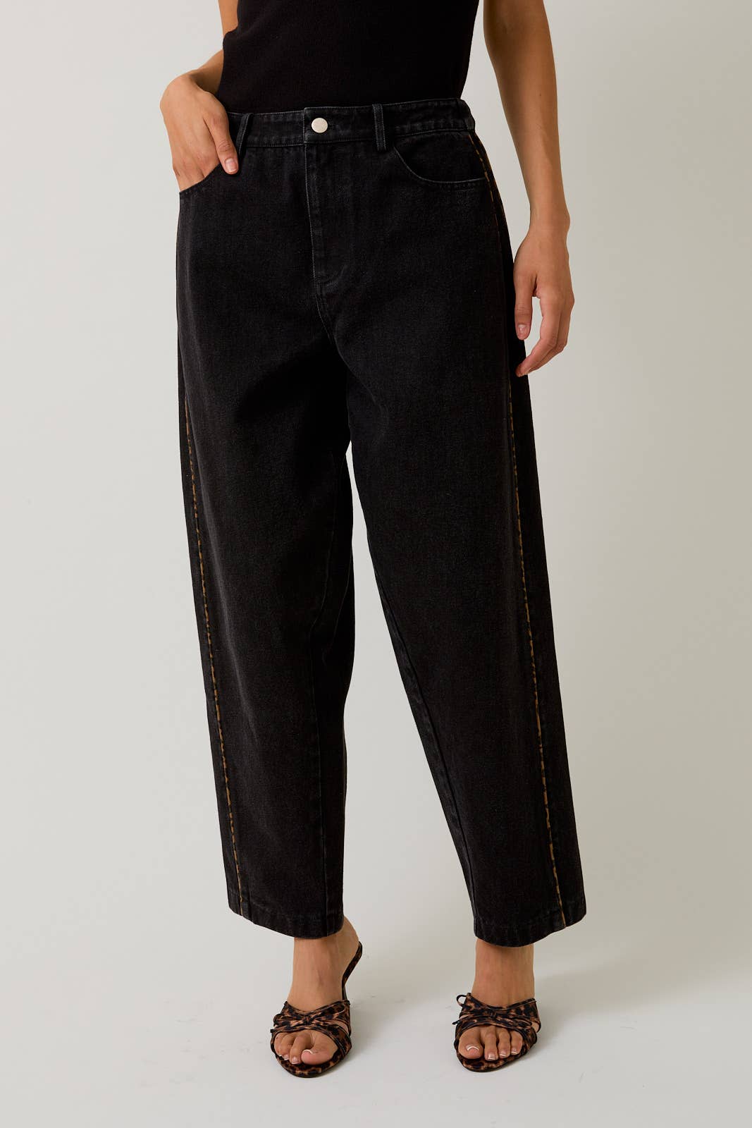 THE PIPING DETAIL ON THIS BARREL JEAN IS JUST THE RIGHT AMOUNT OF ANIMAL PRINT!. A refined addition to your collection, a versatile piece for any elevated ensemble.