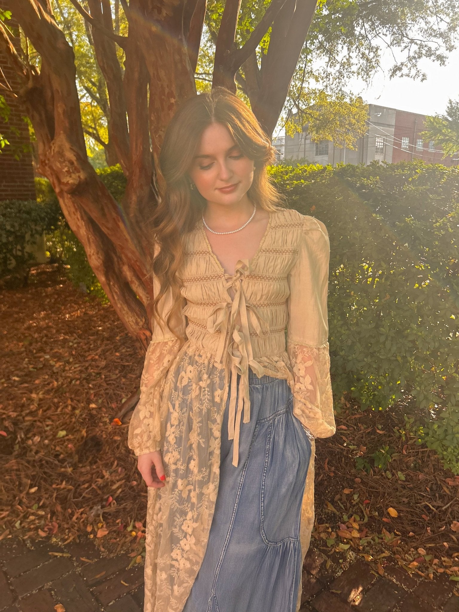 - Sheer Lace Sleeves.