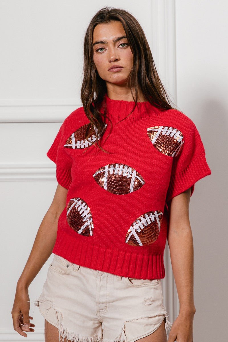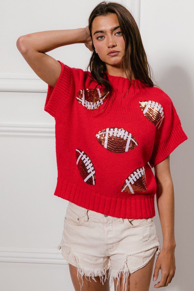 Elevate your game day style with our Red Sequined Football Patch Short Sleeve Sweater. This eye-catching piece combines comfort and flair, making it a must-have for any football fan.