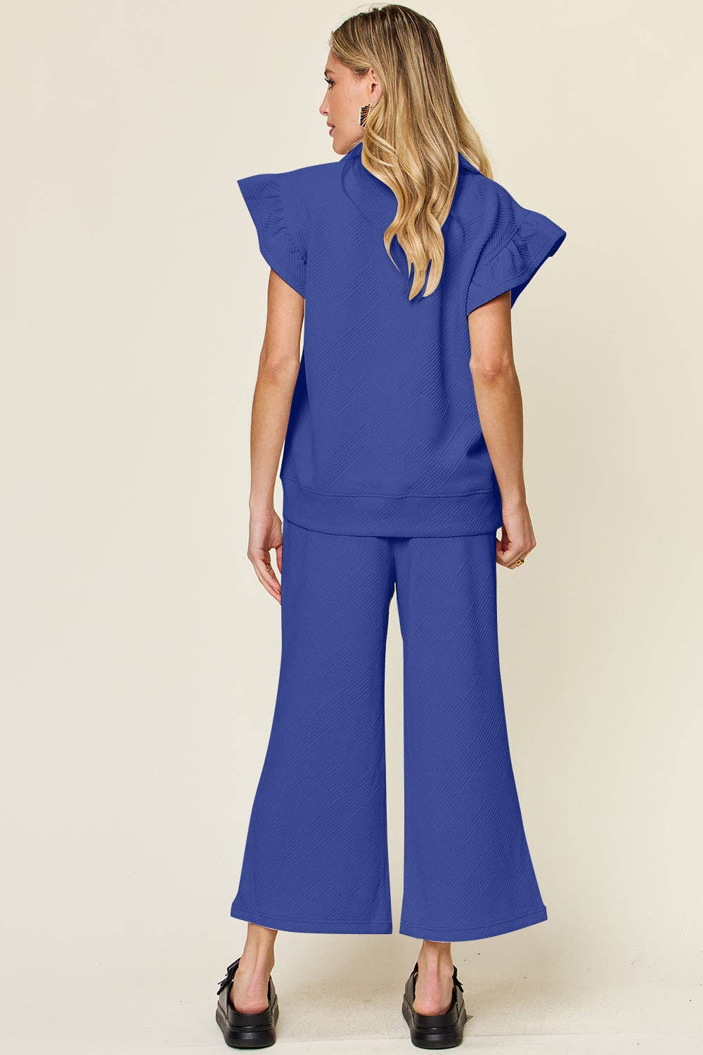 Royal Blue Texture Ruffle Short Sleeve Top and Drawstring Wide Leg Pants Set