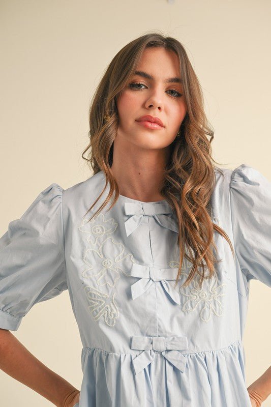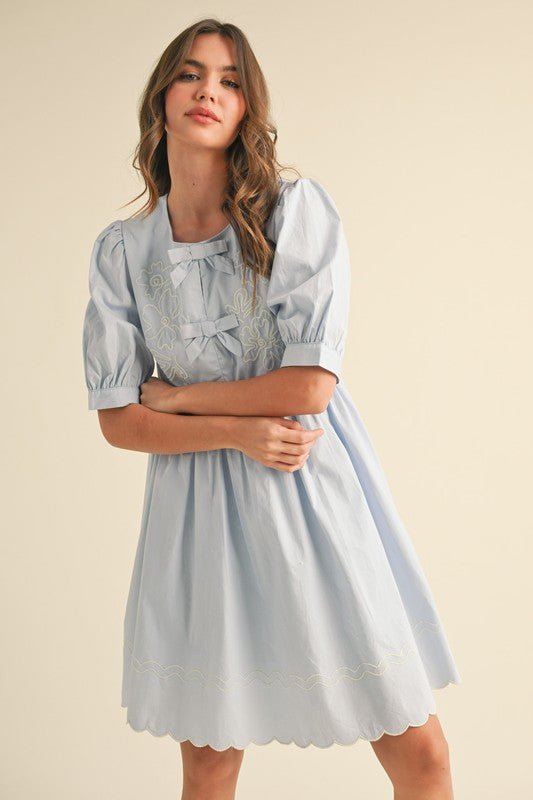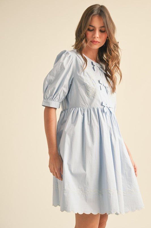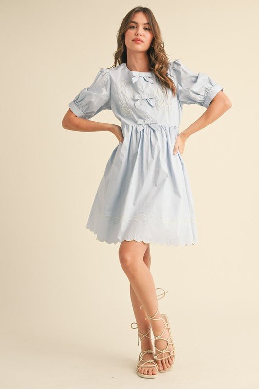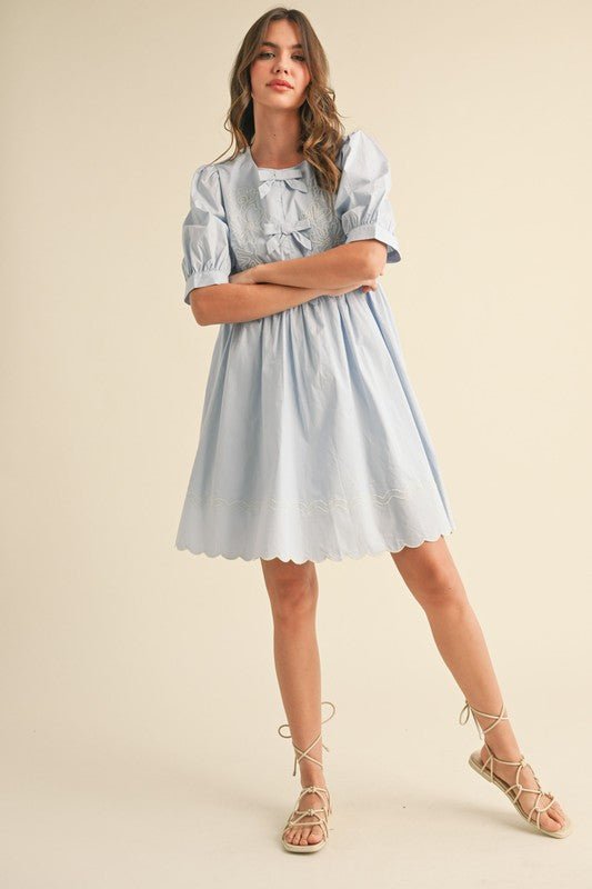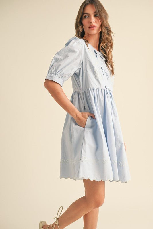 Fairy Blue Floral And Scallop Embroidered Dress with Side Pockets