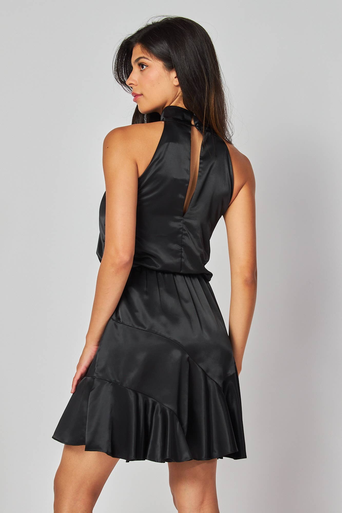 Black Satin Solid Sleeveless Mock Halter Neck Mini Dress