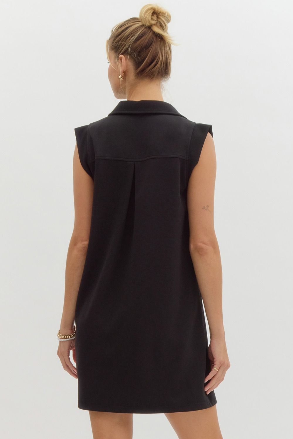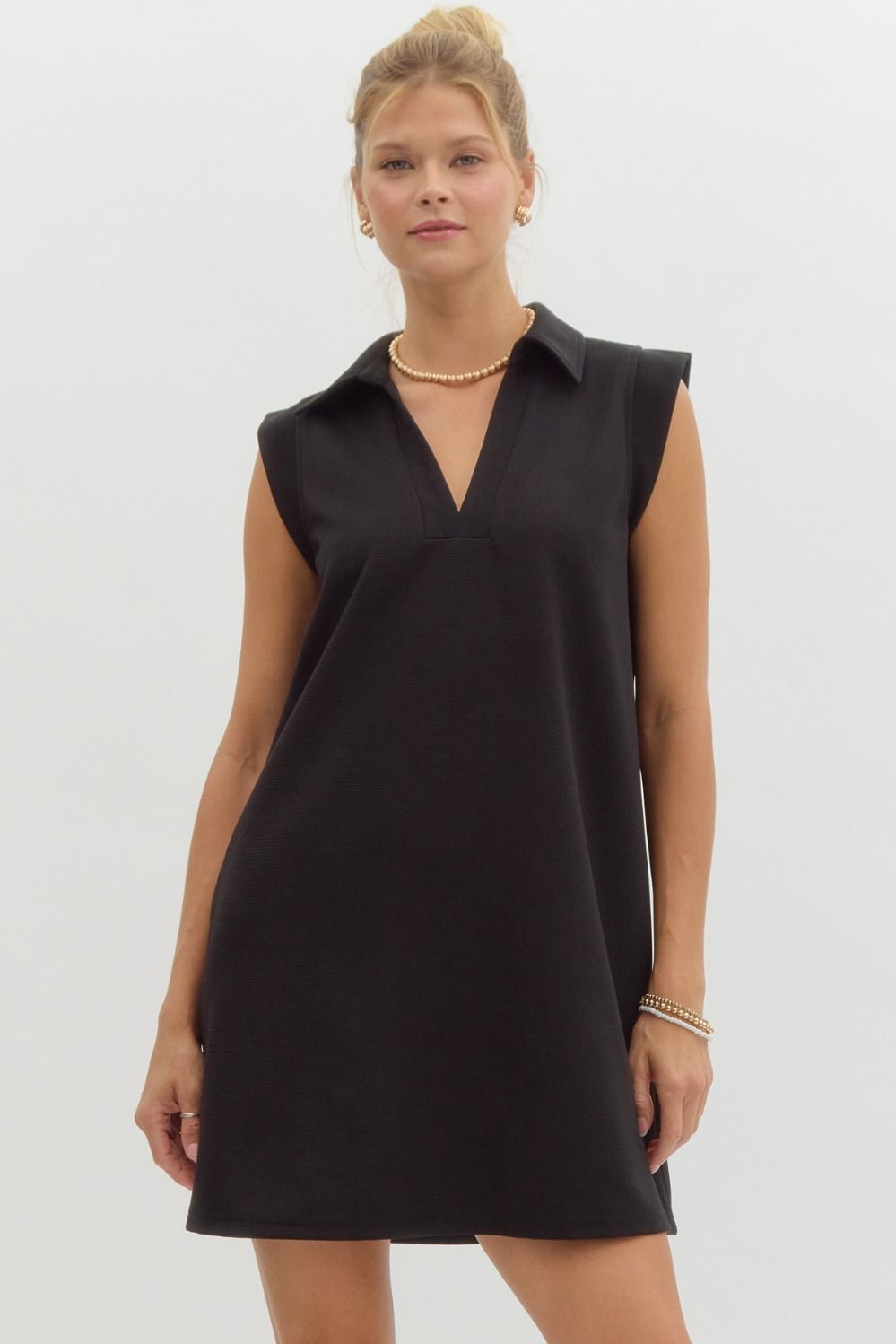 Textured solid collared v-neck sleeveless mini dress featuring pocket at sides. Unlined. Knit. Non-sheer. Lightweight.