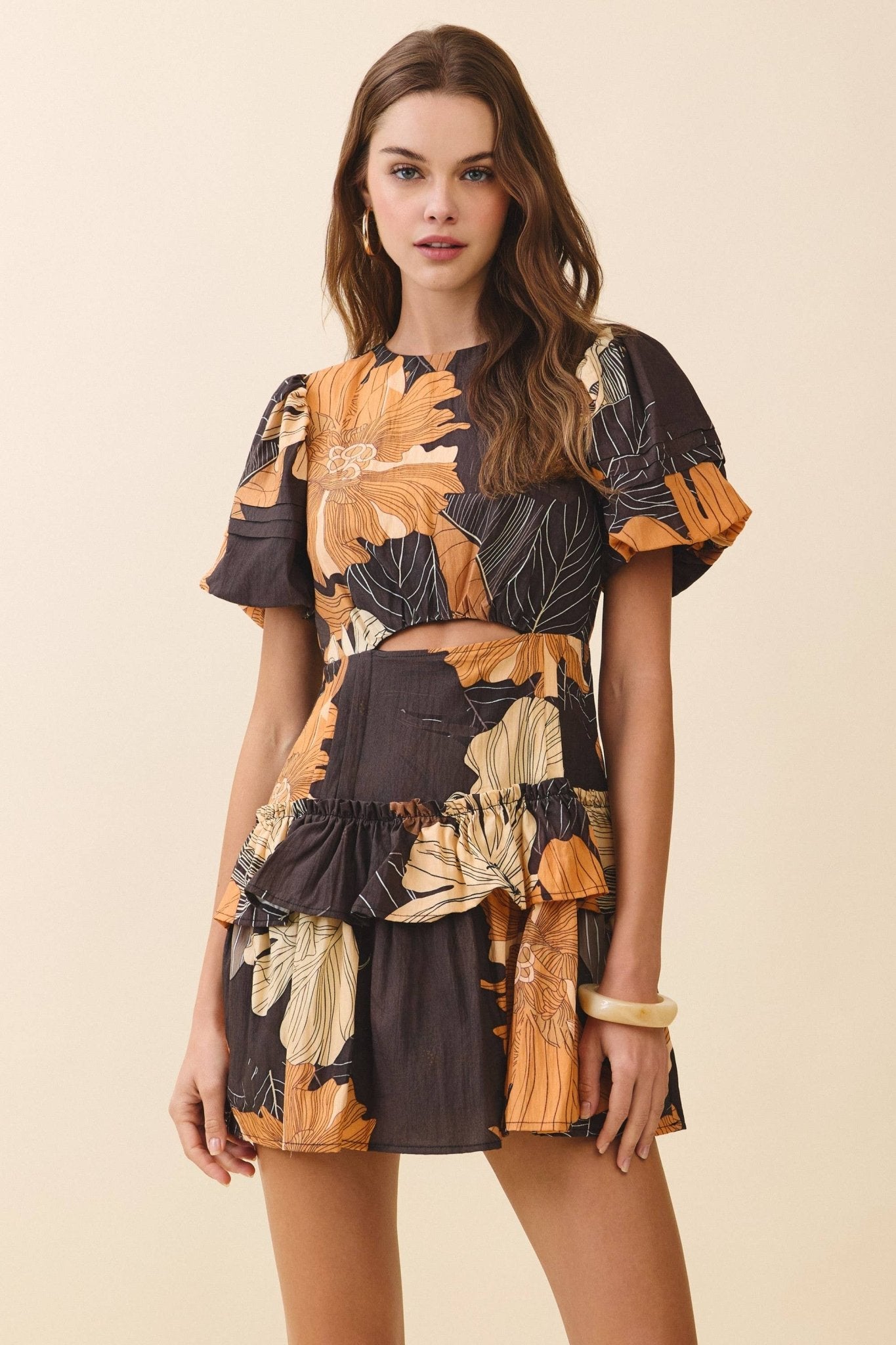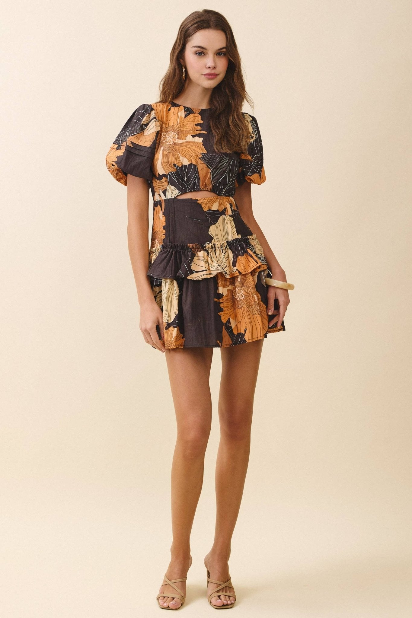 A puff sleeve mini dress designed in a bold floral print. Featuring a round neckline and a fitted bodice with side waist cutout. The ruffled peplum overlay adds volume and shape, flowing into a playful mini skirt. Finished with short puff sleeves and a back concealed zipper closure.