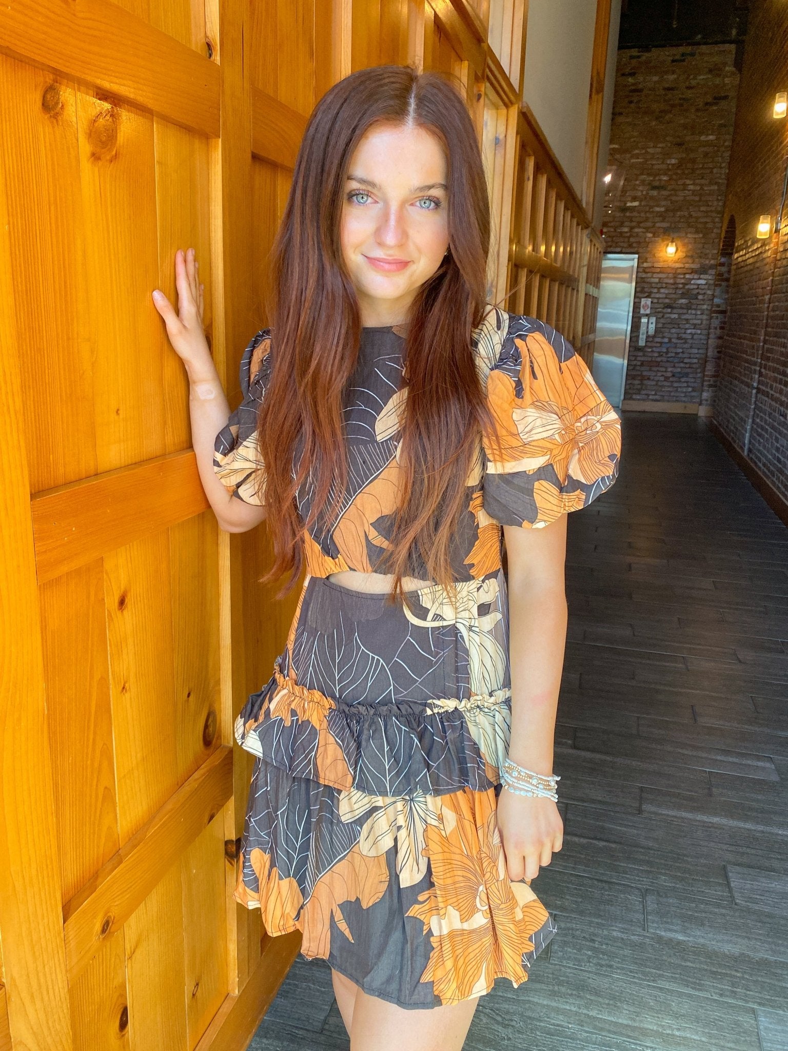 Black Floral Print Fitted Bodice Waist Cutout Mini Dress