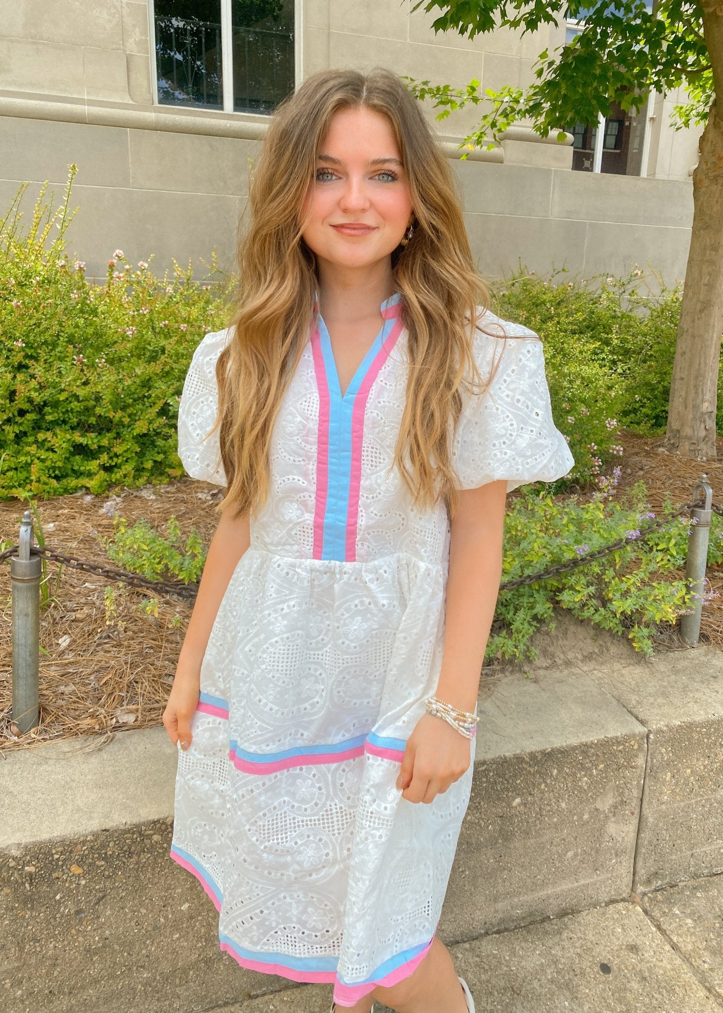 Stay Effortlessly chic in this charming eyelet mini dress, perfect for warm weather occasions.Pair it with sneakers for a relaxed look, or elevate it with heels or sandals.