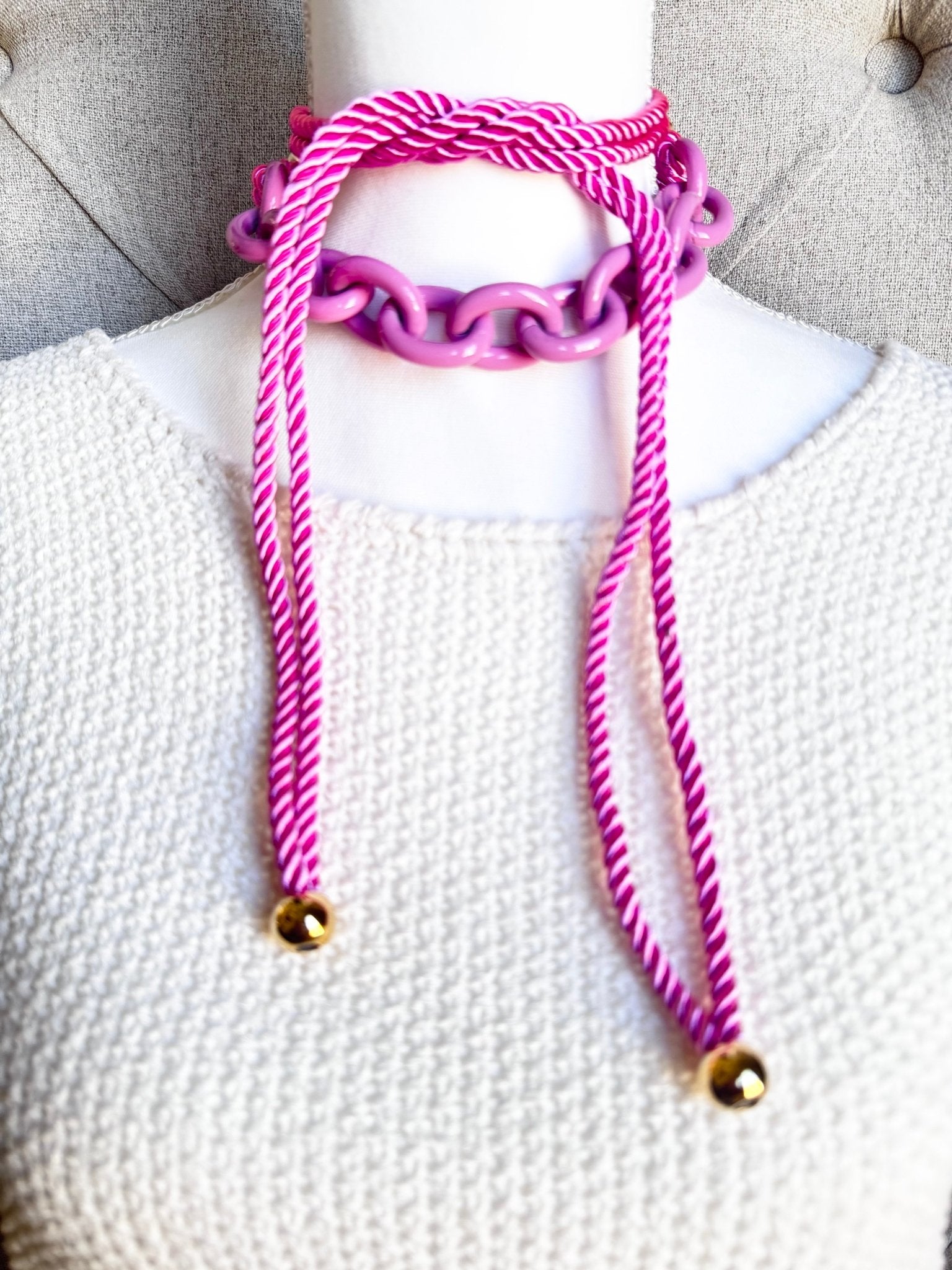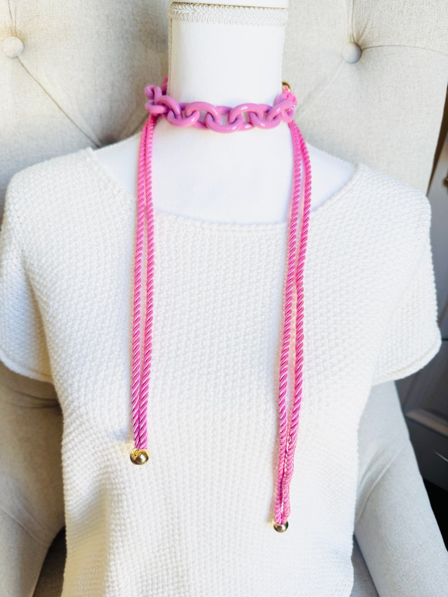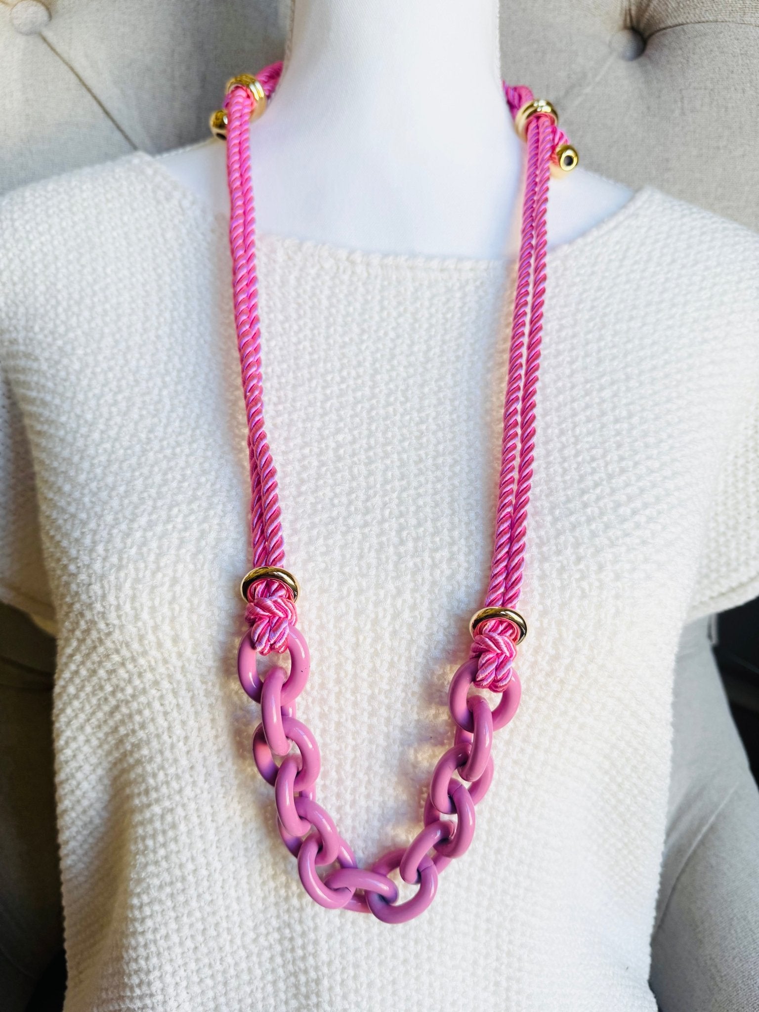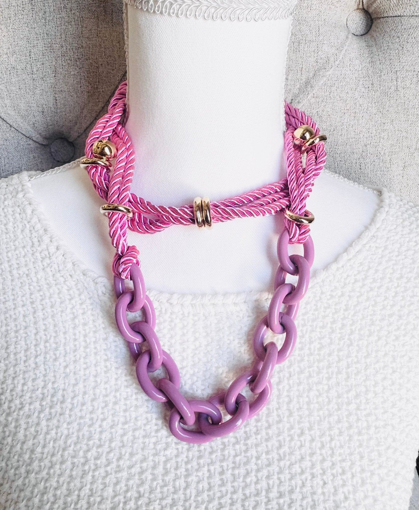 Pink Chain and Silk Rope Layering Convertible Statement Necklace with Gold Plated Accents with so many styling options.