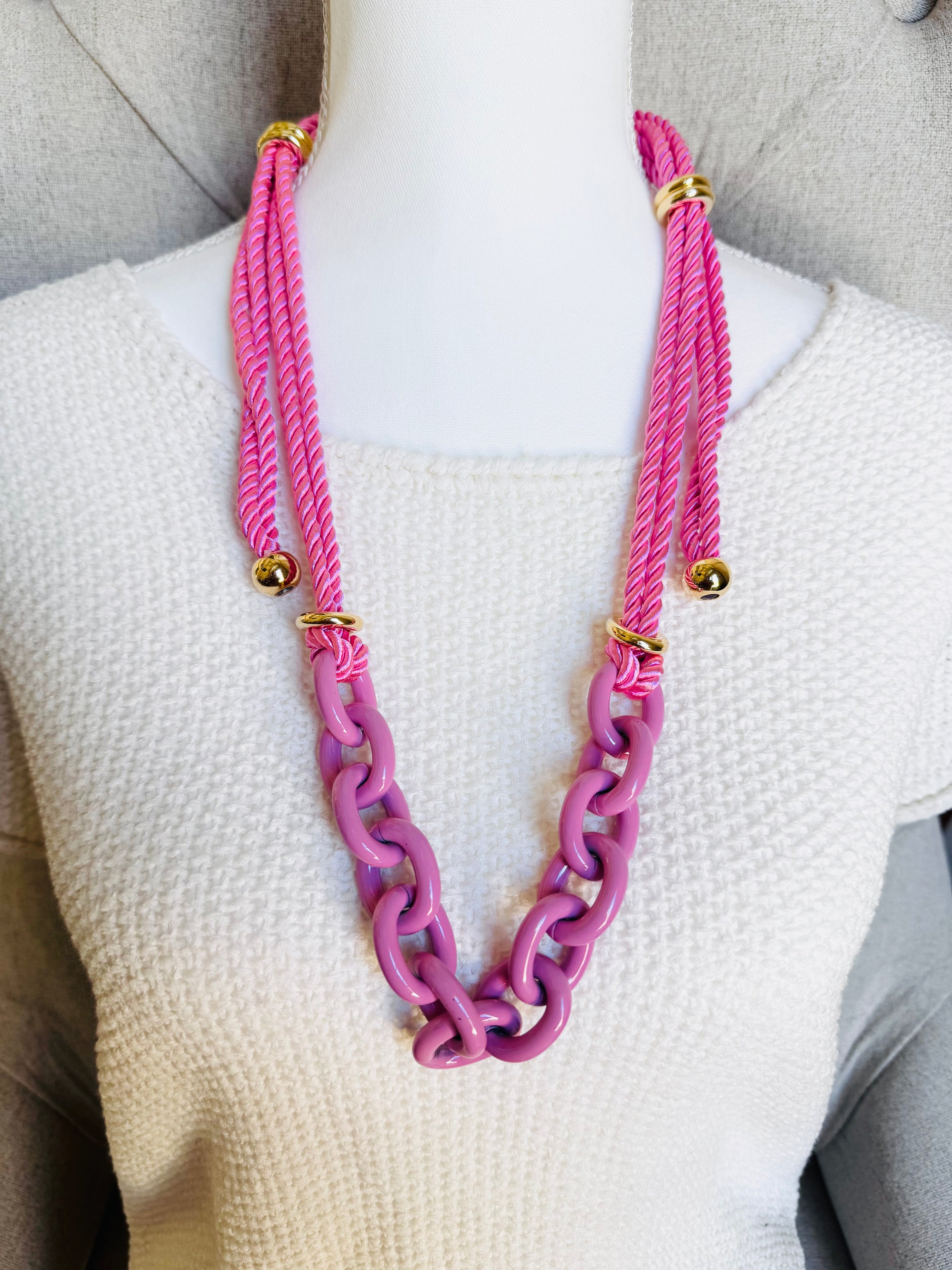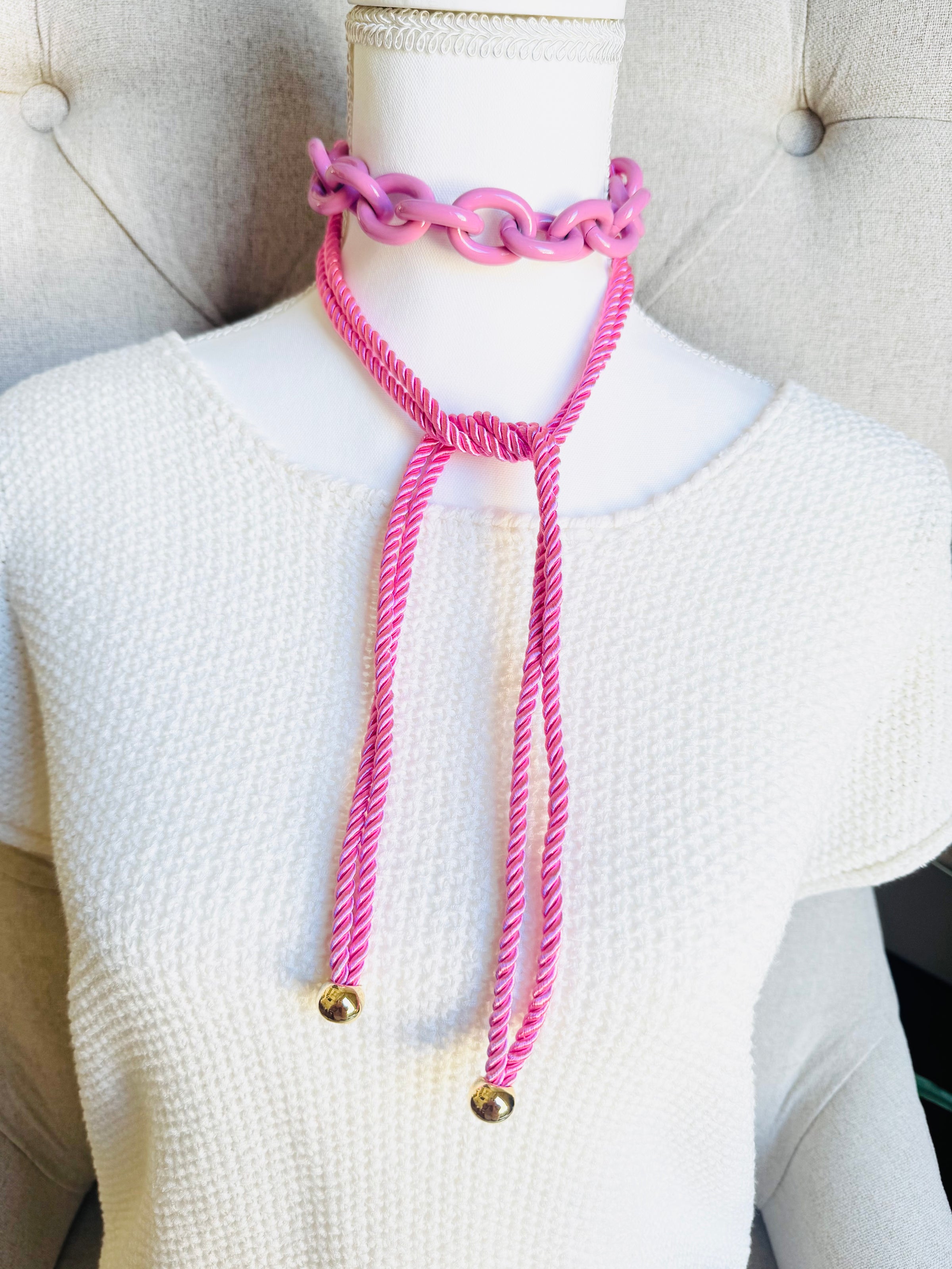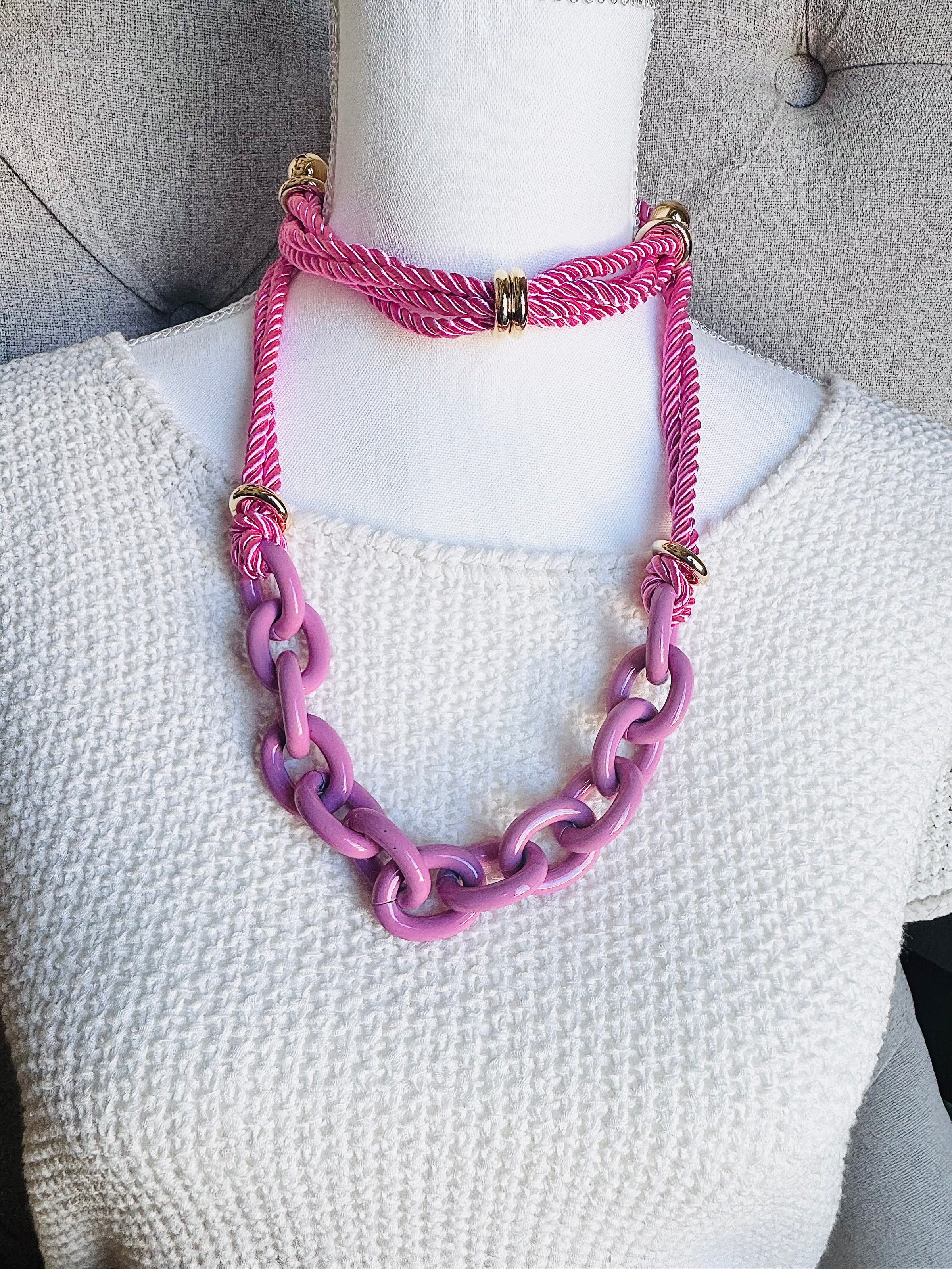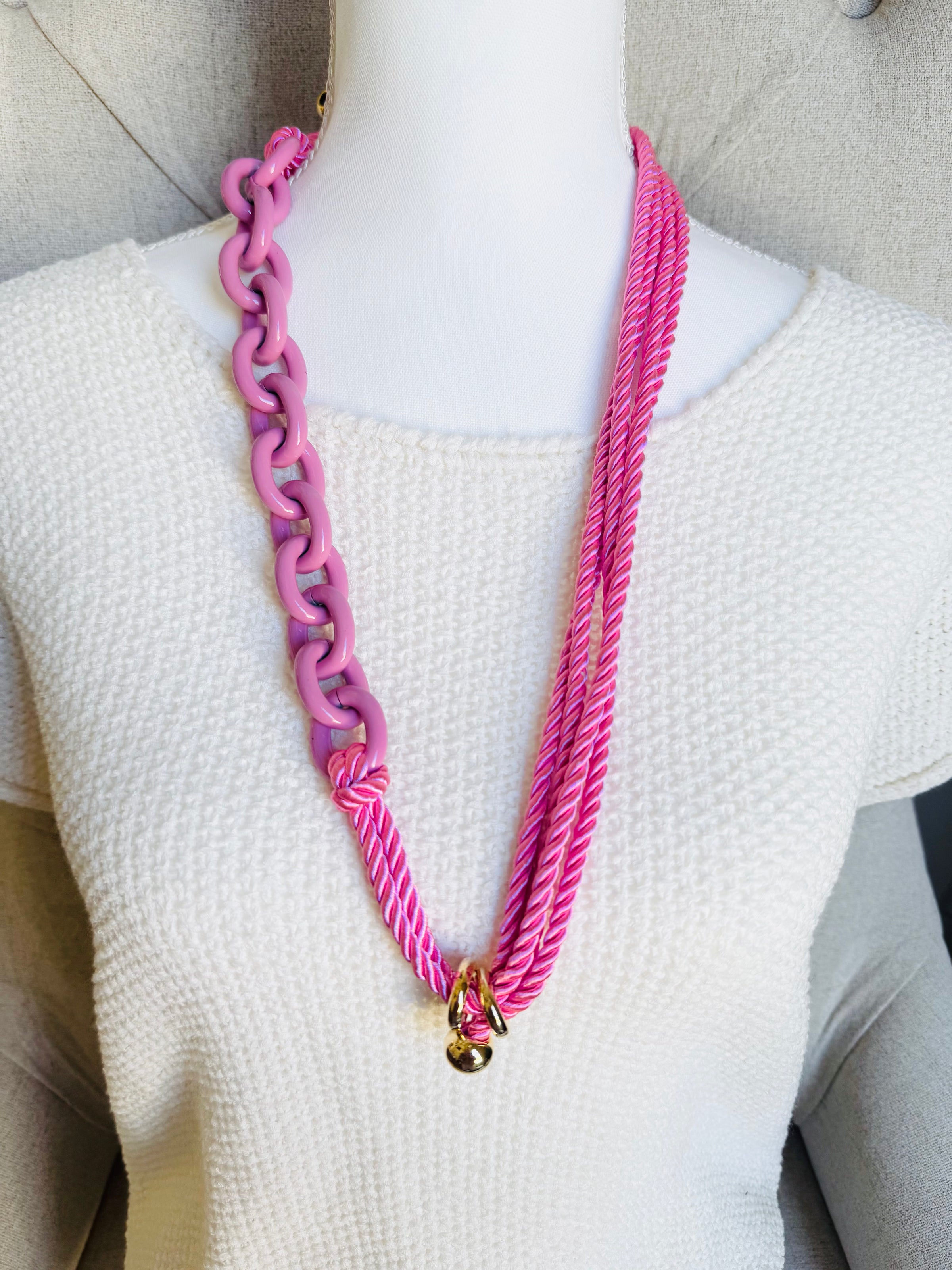 Pink Chain and Silk Rope Layering Convertible Statement Necklace with Gold Plated Accents with so many styling options.