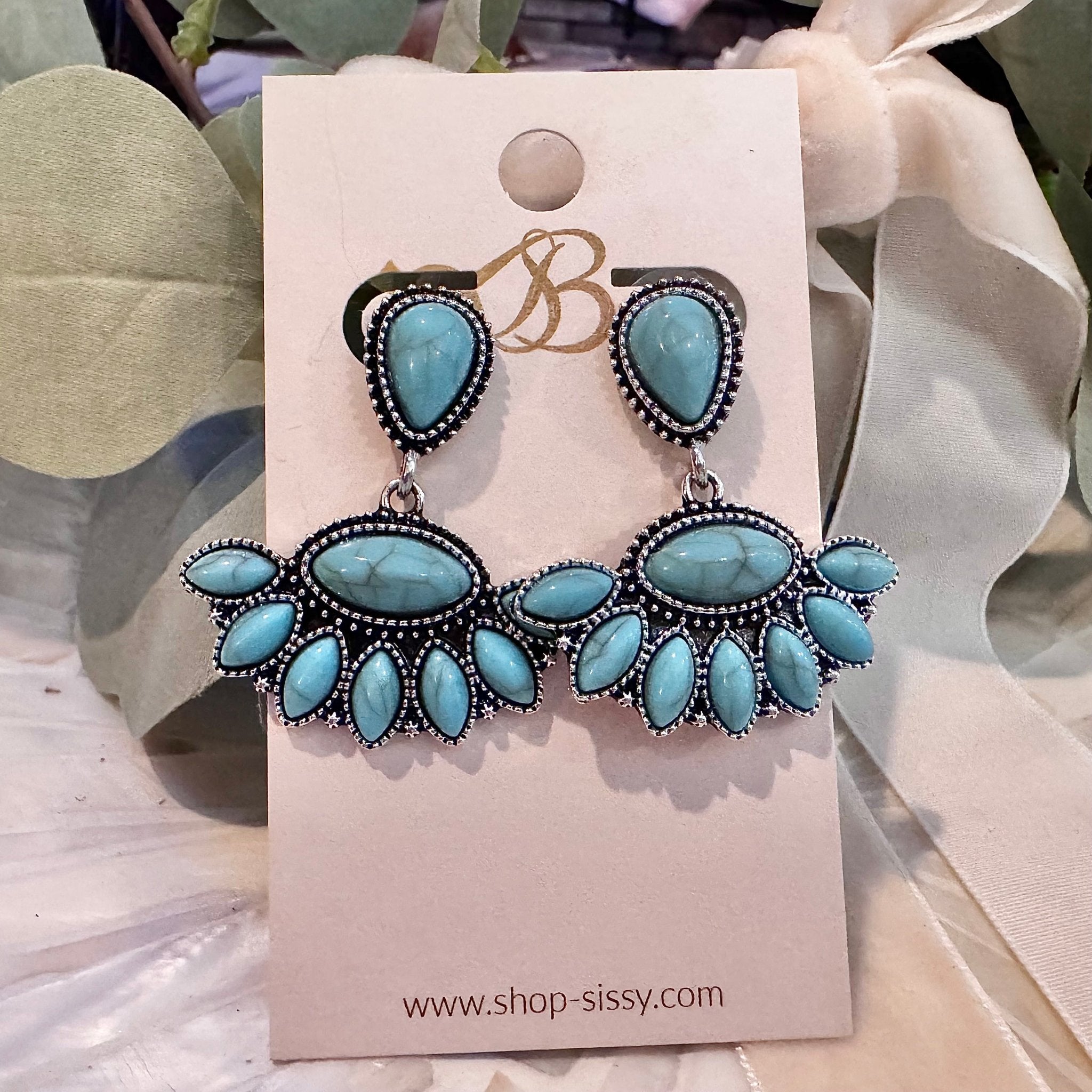 Turquoise Stone and Silver Western Fan Drop Earrings