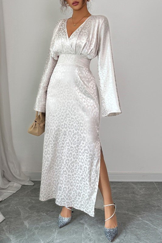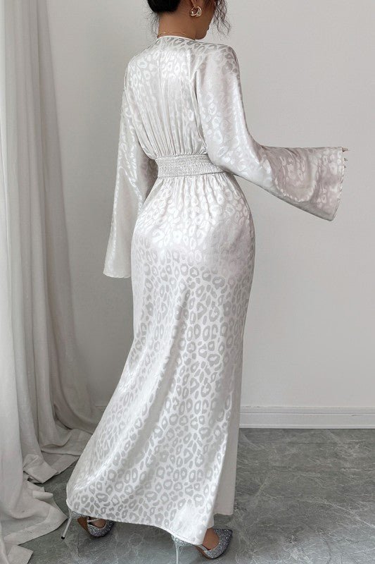 A white formal maxi dress with a surplice wrap design, leopard embossing, long bell sleeves, and a side slit, creating a graceful silhouette for evening wear. 100% Polyester