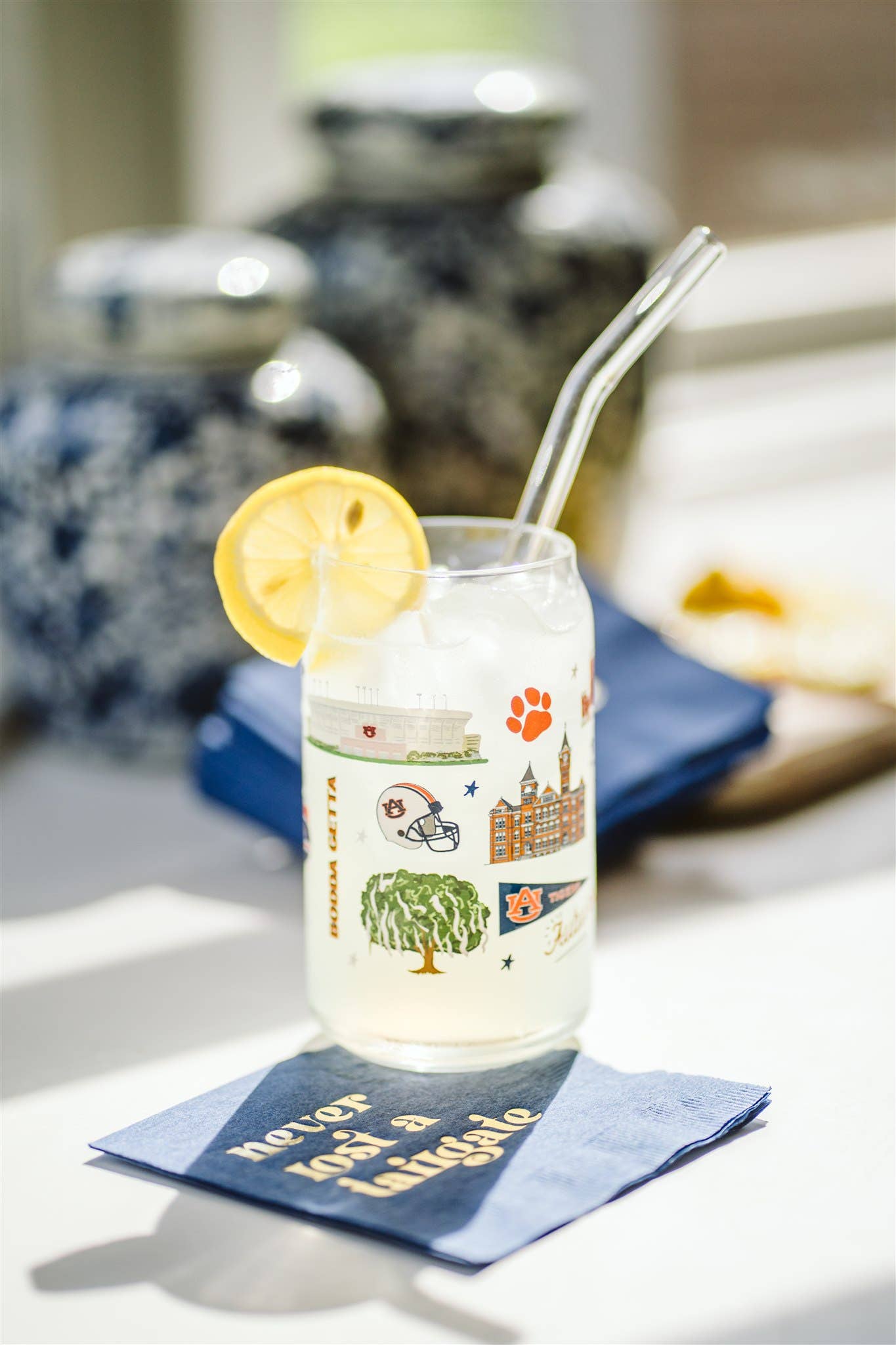 16 oz full color glass cup featuring important Auburn icons, such as Aubie, Samford Hall, Jordan-Hare Stadium, Neville arena, and more!