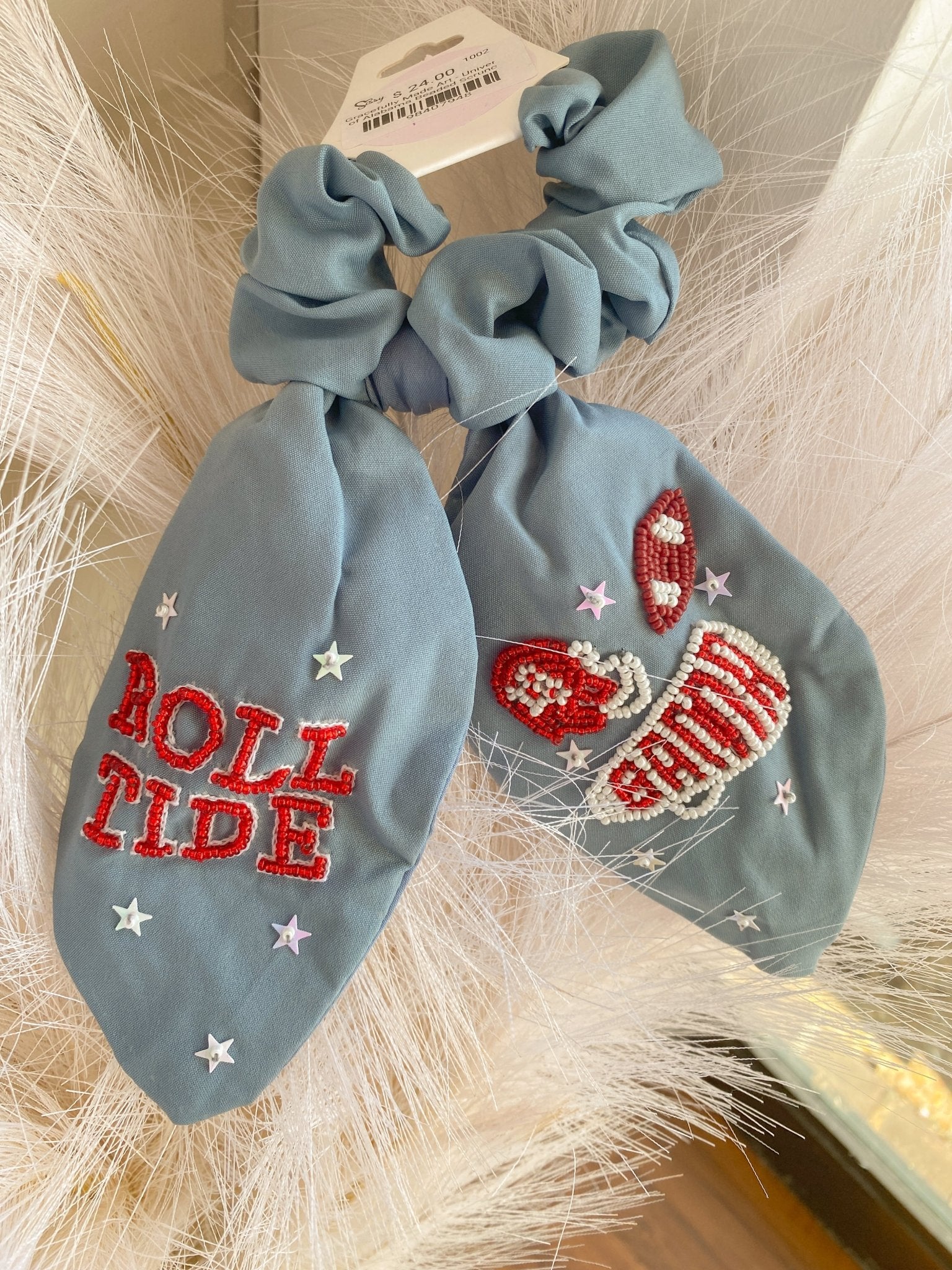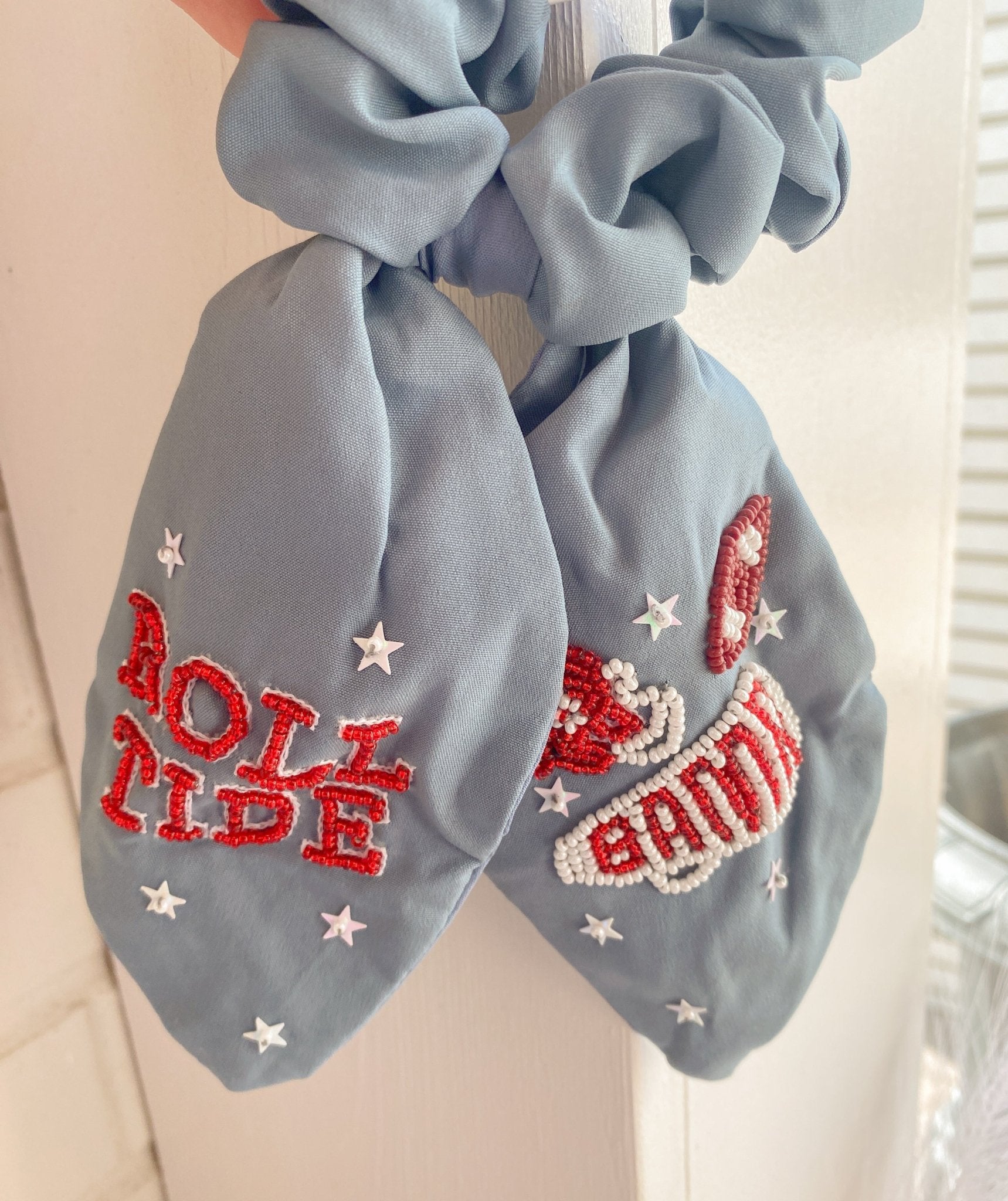 This adorable light grey Alabama beaded scrunchie is perfect for Bama fans of all ages! The scrunchie has two trailing ribbons with the Alabama helmet, megaphone, football, and "Roll Tide" beaded on them.
