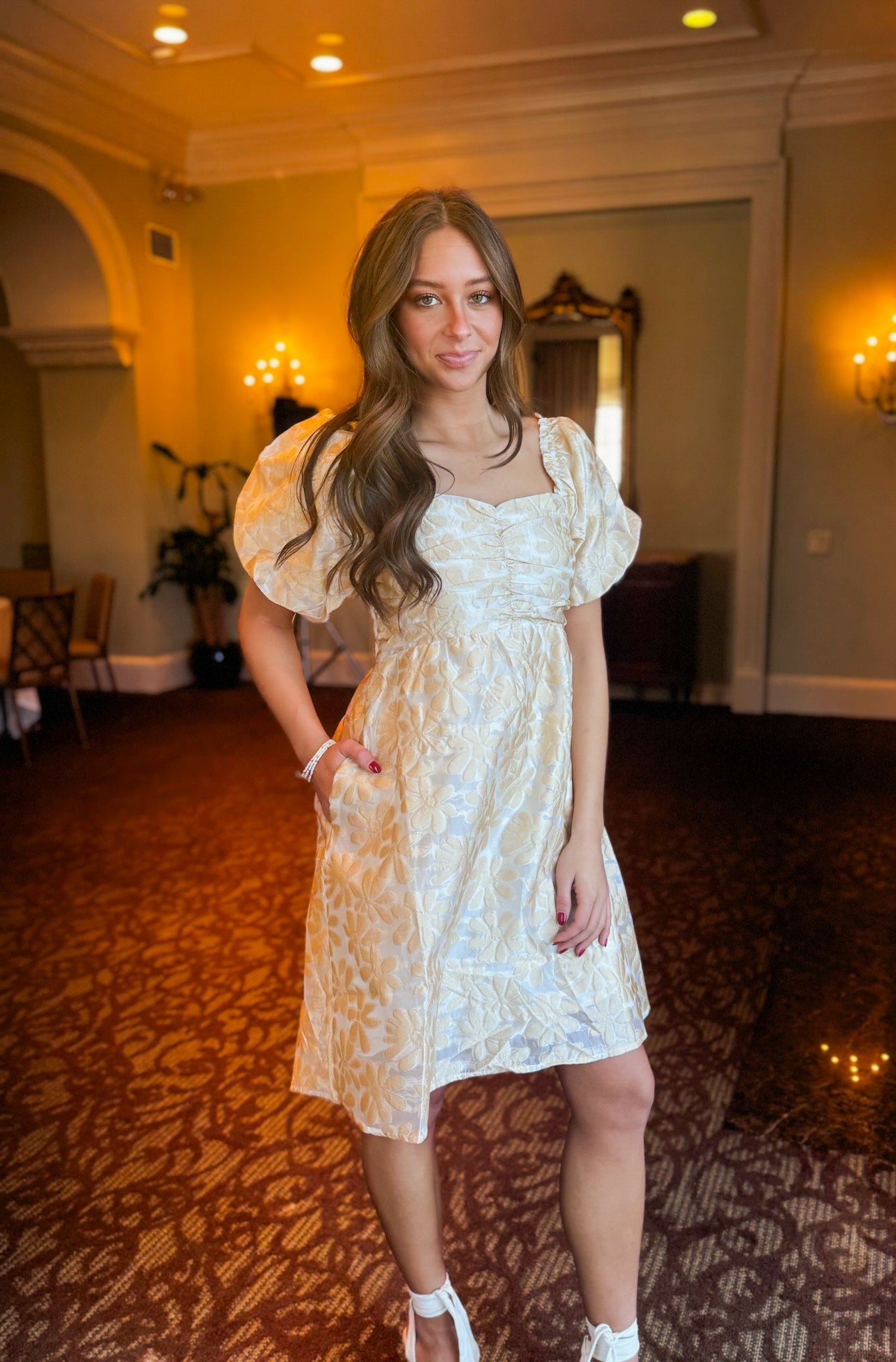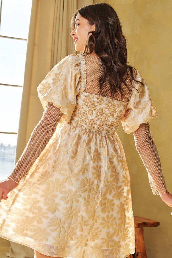CHAMPAGNE FLORAL TEXTURED A LINE SKIRT PUFF SLEEVES DRESS