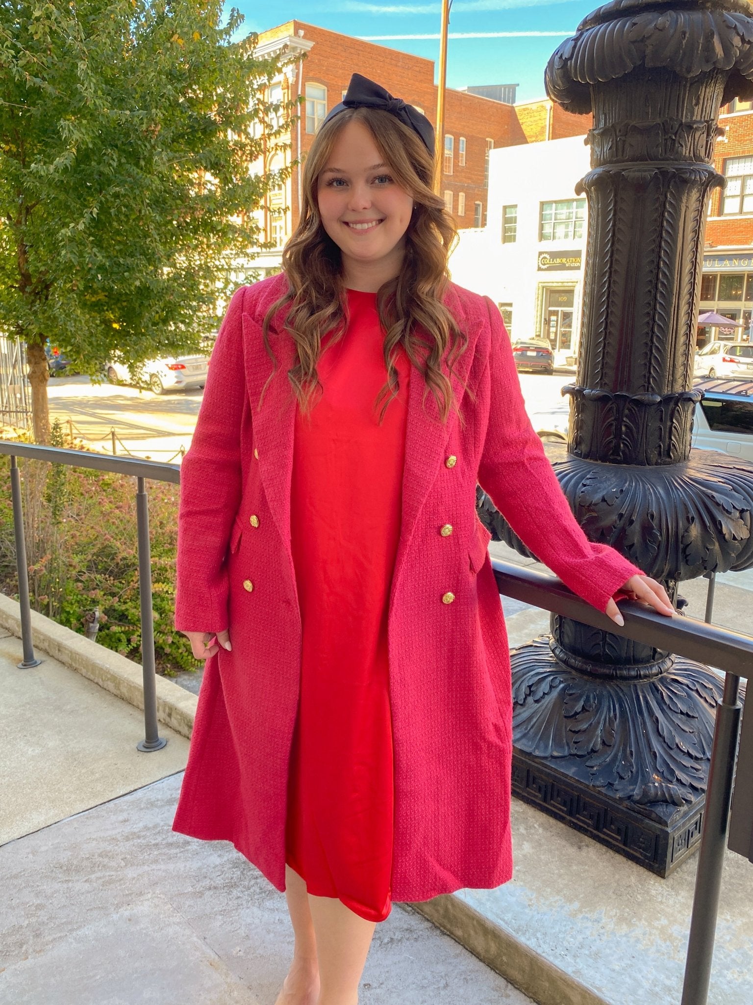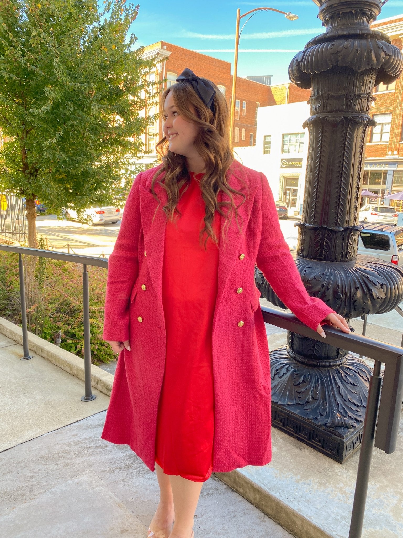 Textured Tweed Double-Breasted Long Coat -Tailored fit-and-flare silhouette with peaked lapels and double-breasted front -Textured tweed fabric offers timeless elegance -Gold-tone buttons add a refined touch -Long sleeves with clean, structured shoulders -Flap pockets at the hip back vent.