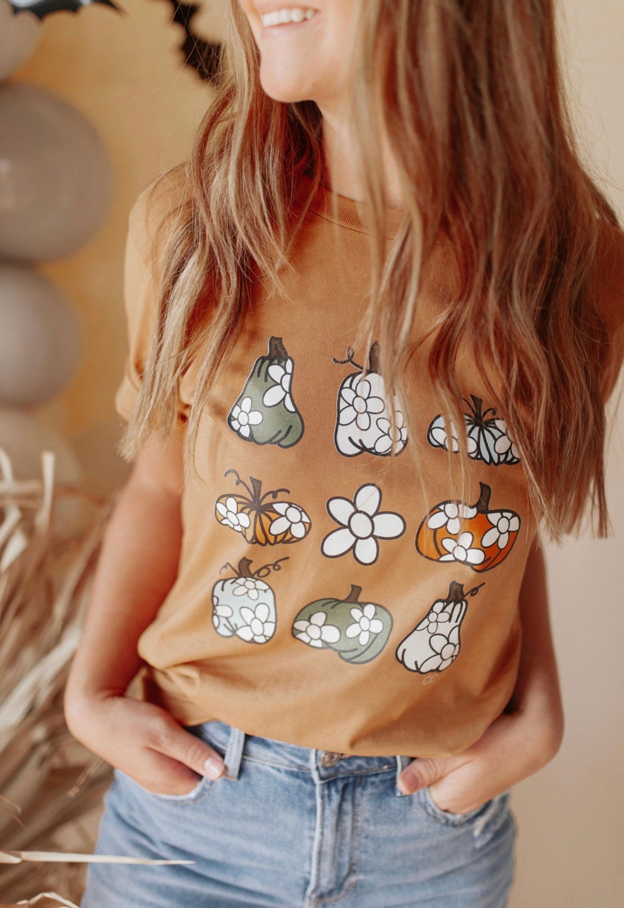 DAISY PUMPKINS ON BURNT ORANGE BELLA CANVAS CREW NECK GRAPHIC TEE