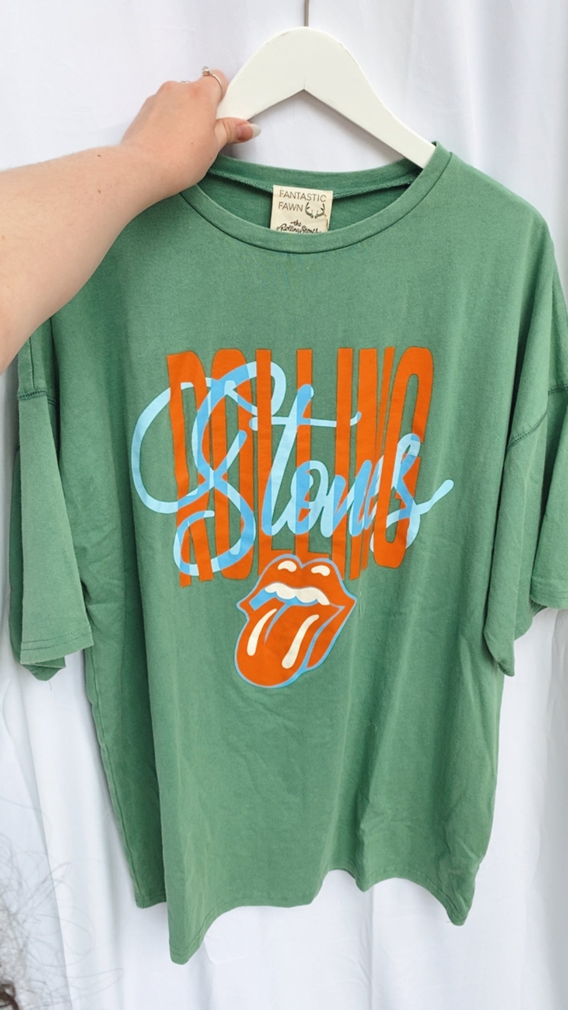 GREEN AND ORANGE ROLLING STONES GRAPHIC BAND TEE