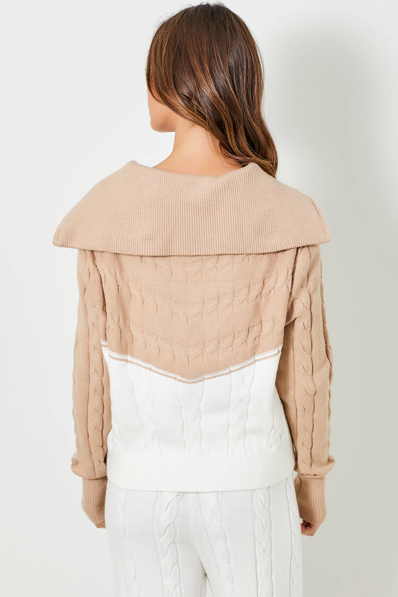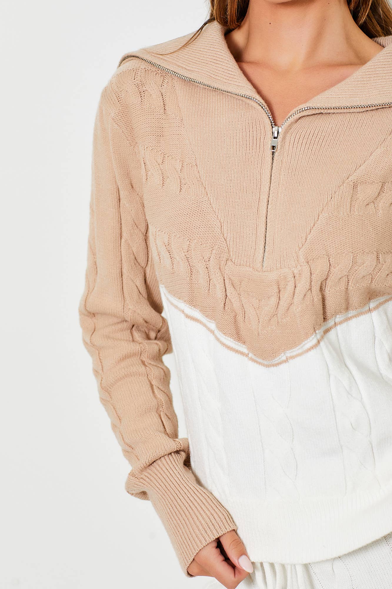 TAUPE/IVORY FRONT ZIP CABLE KNIT SWEATER